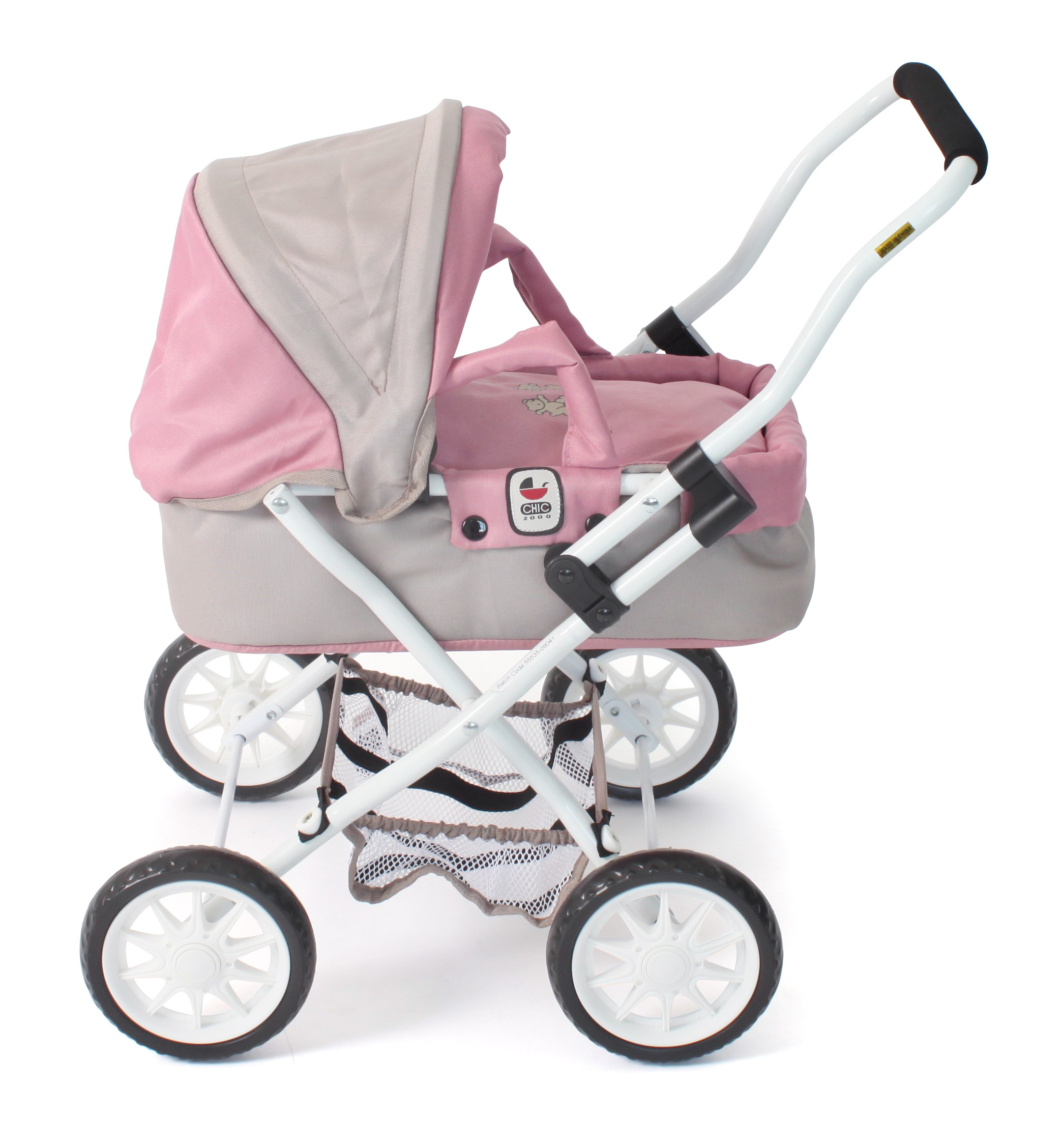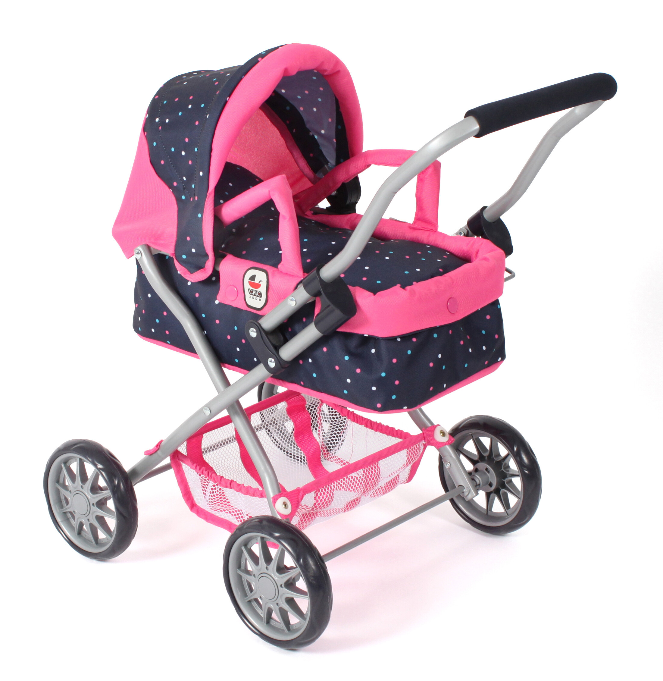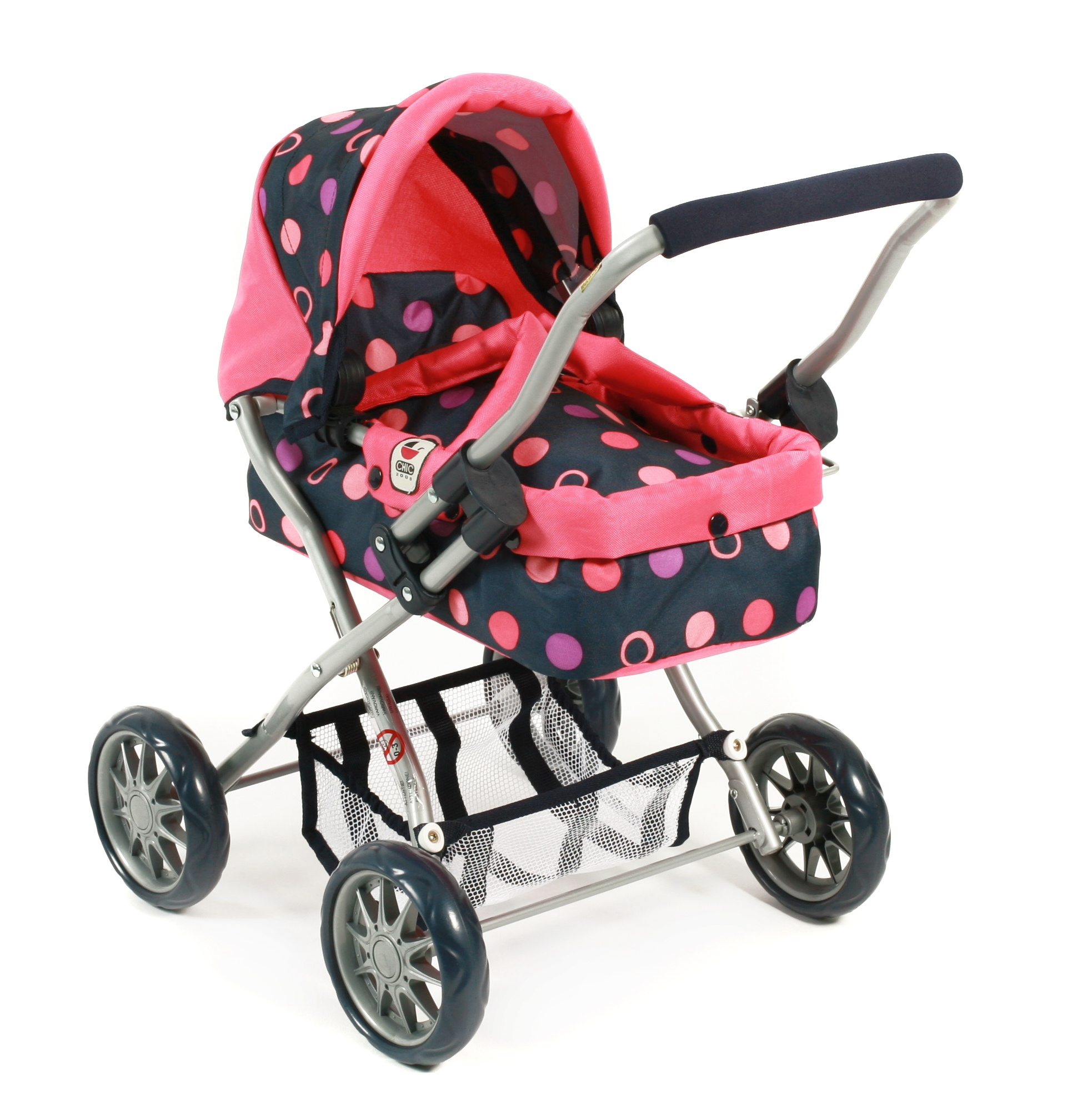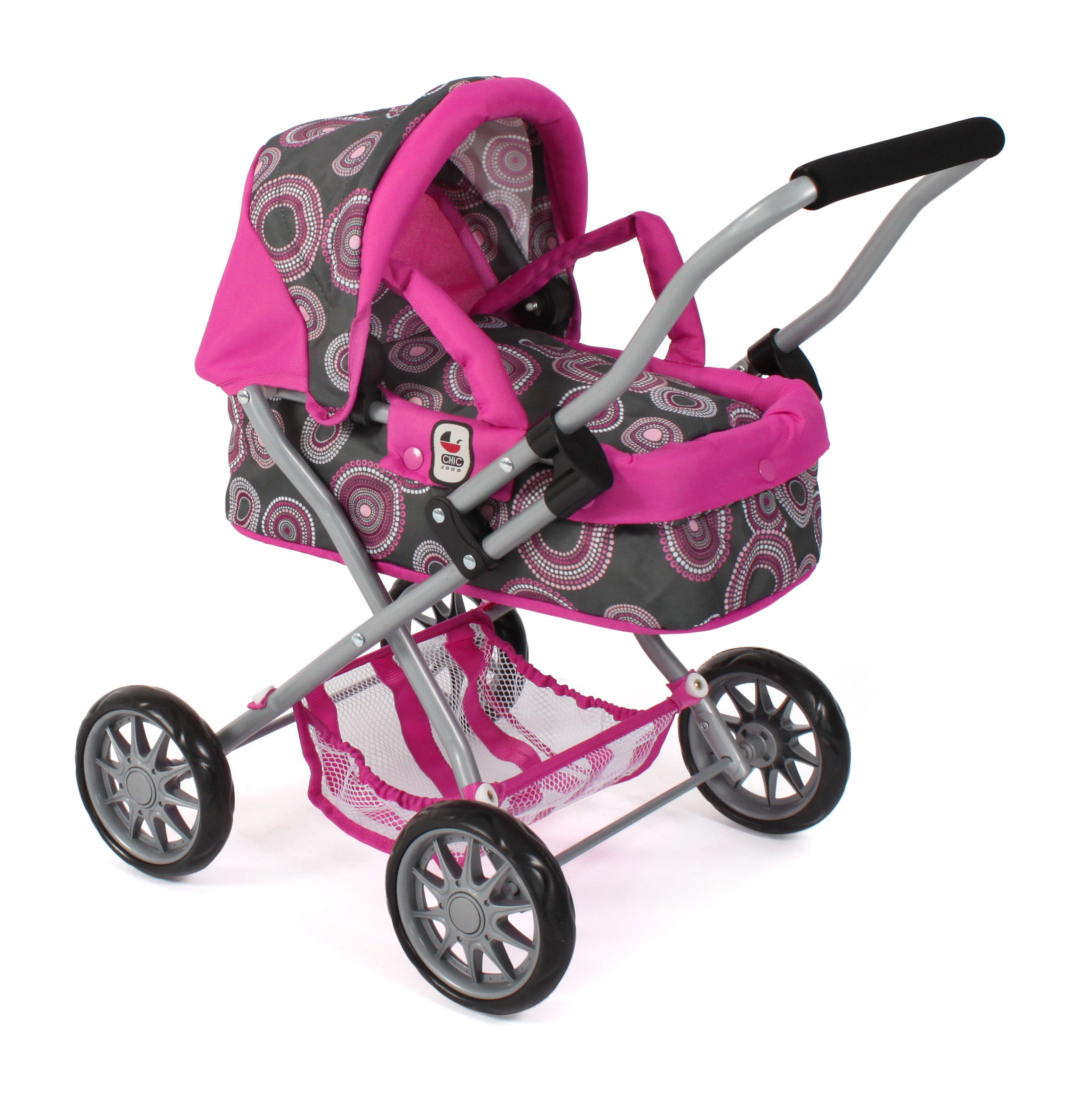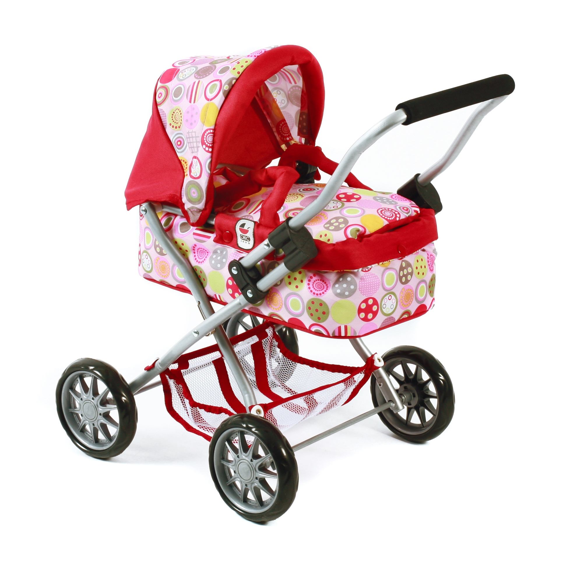 Krásný malinký kočárek pro panenky s vyjímatelnou taškou.