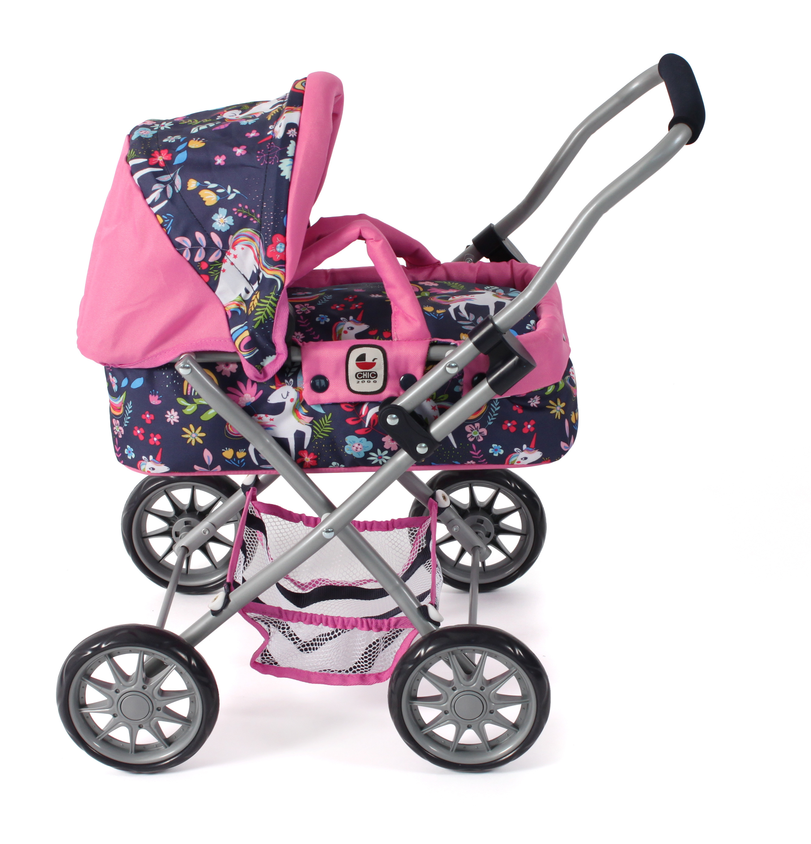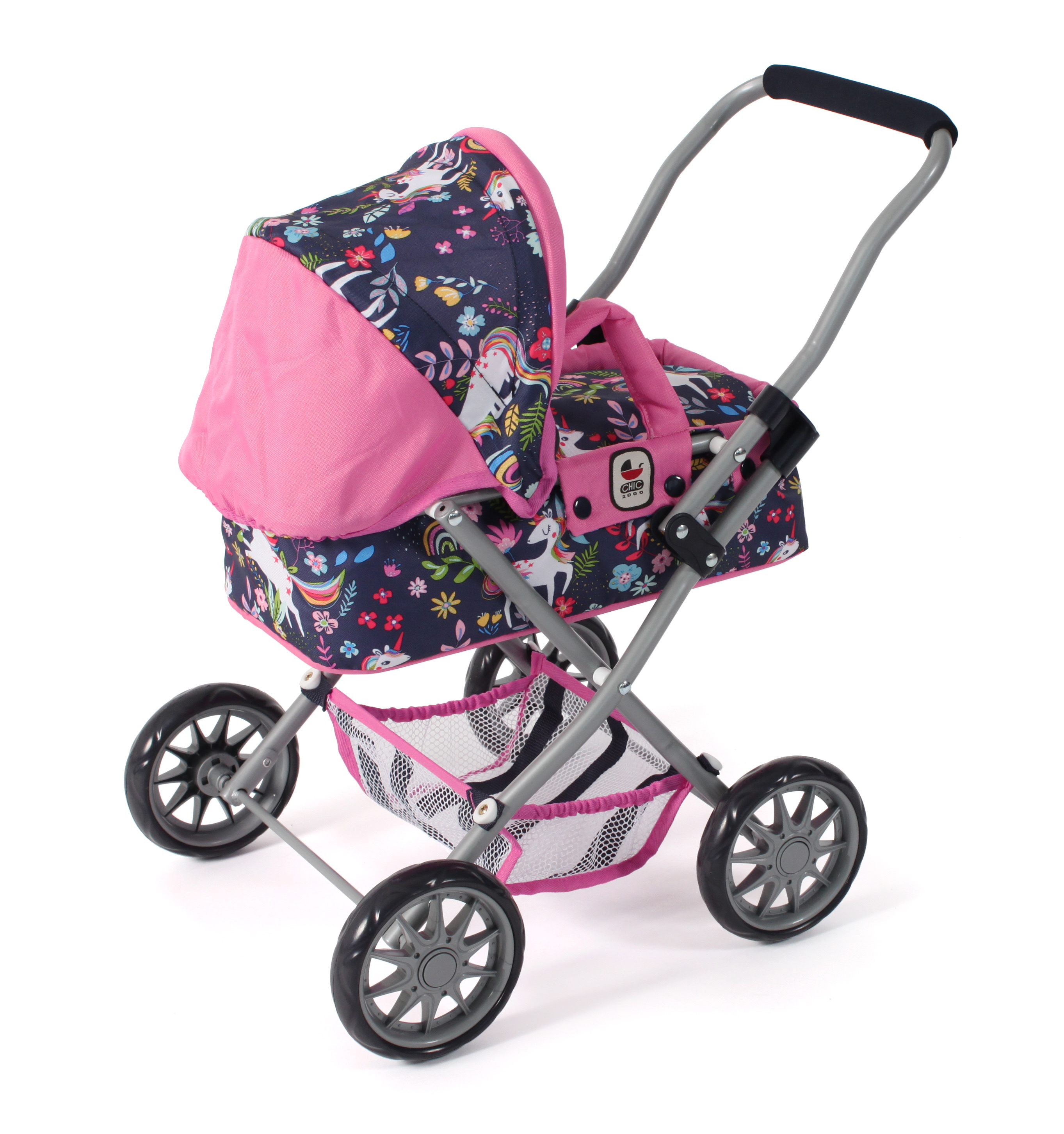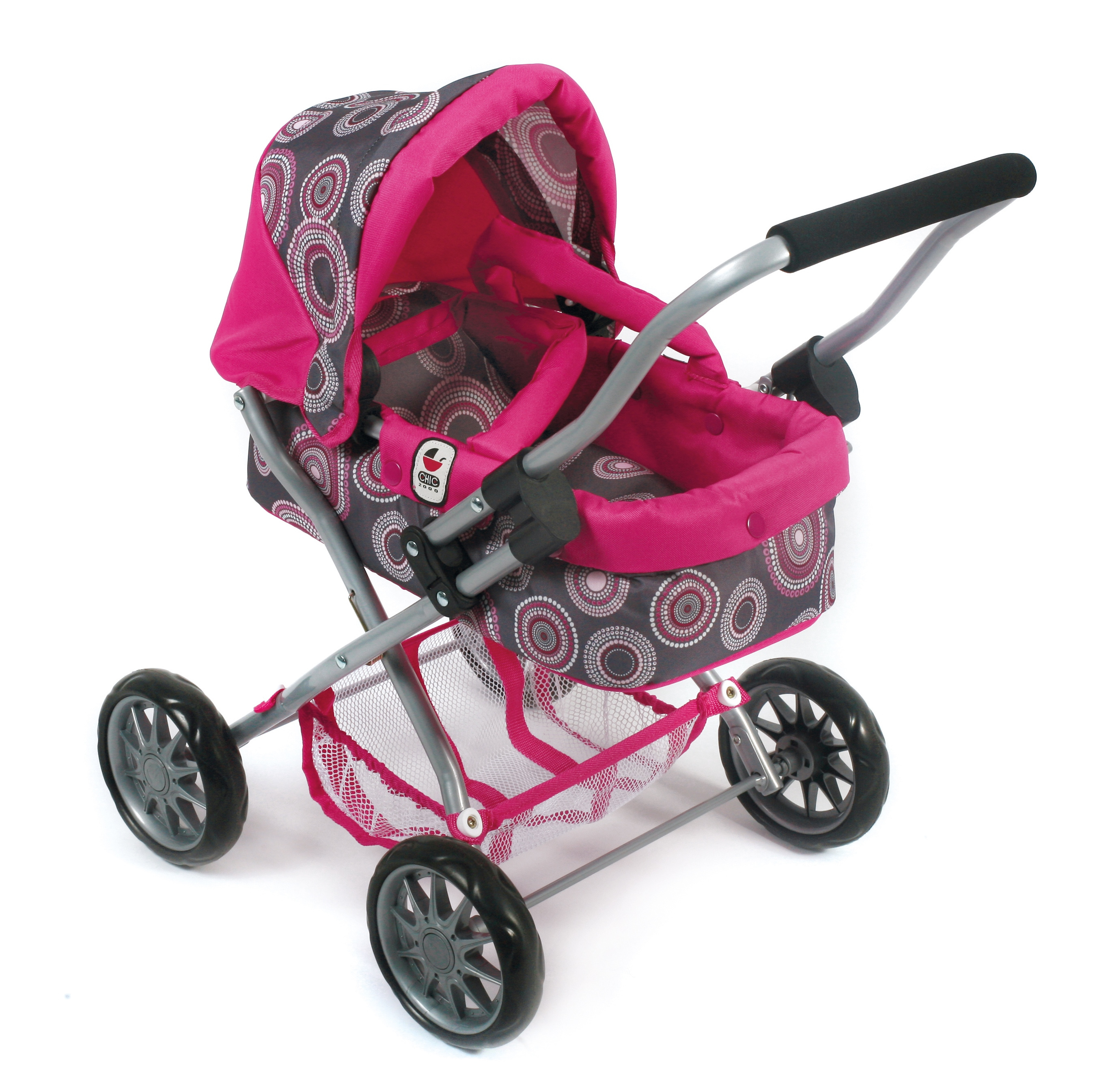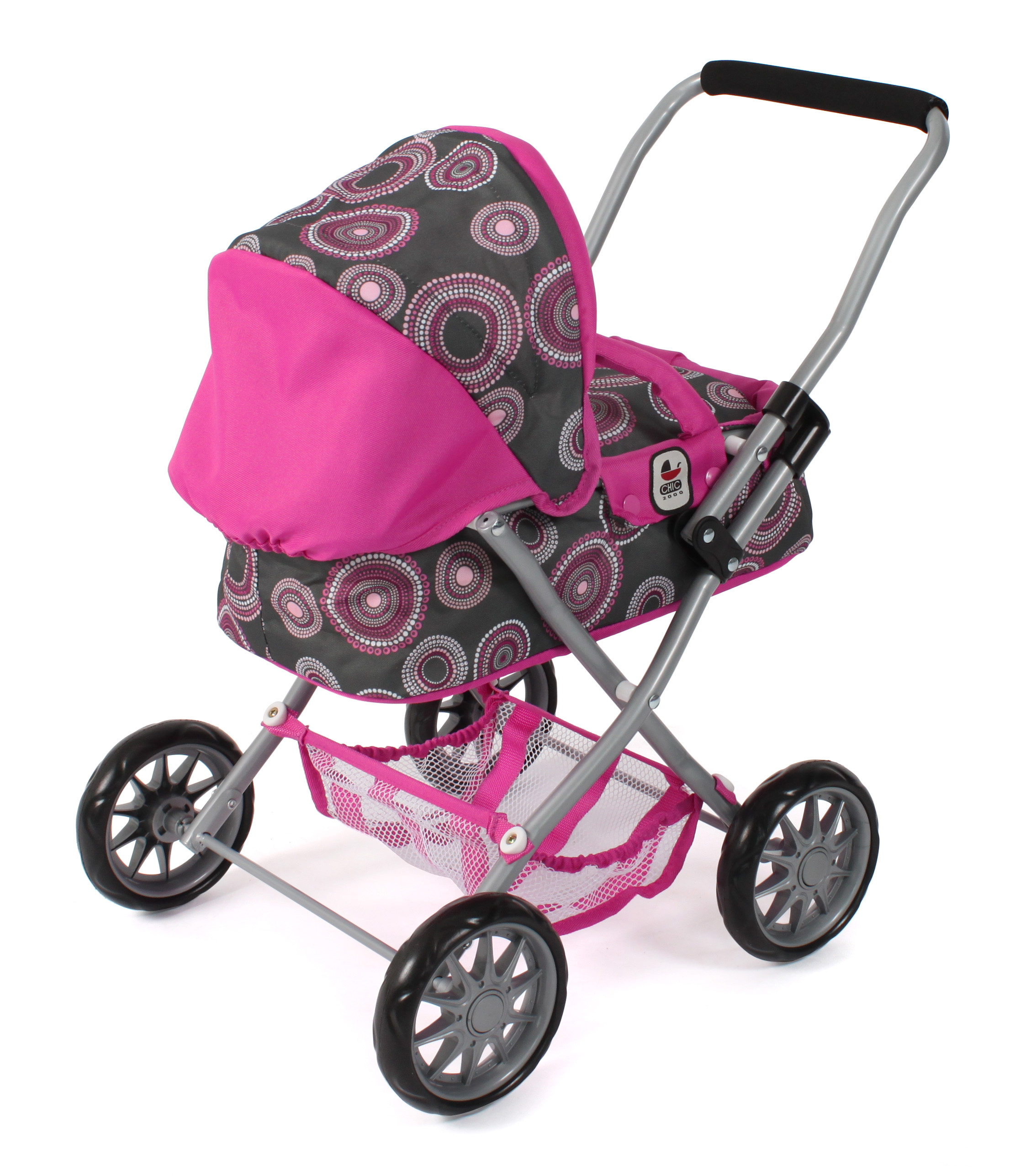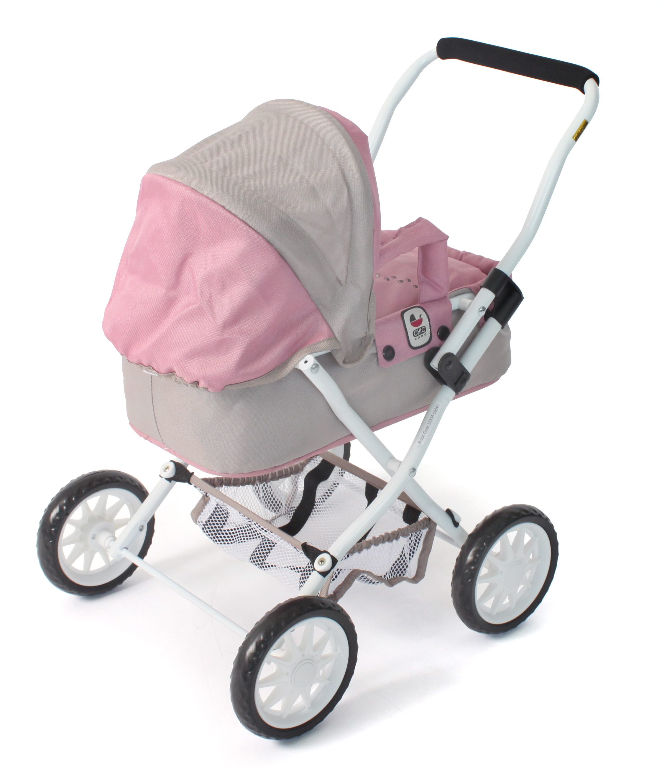 Krásný malinký kočárek pro panenky s vyjímatelnou taškou.