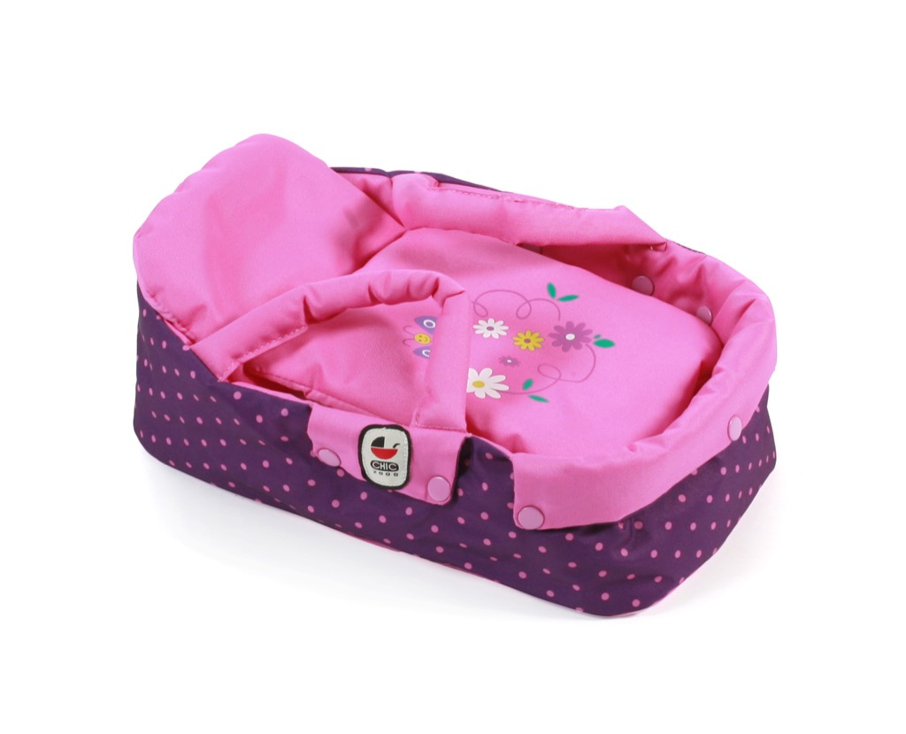 Autosedačka pro panenku do 45 cm. Výrobek obsahuje bryndáček pro panenku ve stejné barvě, přichycený na suchý zip. Pro přenášení je autosedačka vybavena sklopným madlem, které je opatřeno pěnovou gumou. Rozměry: š31 x v31 x hl 47 cm.