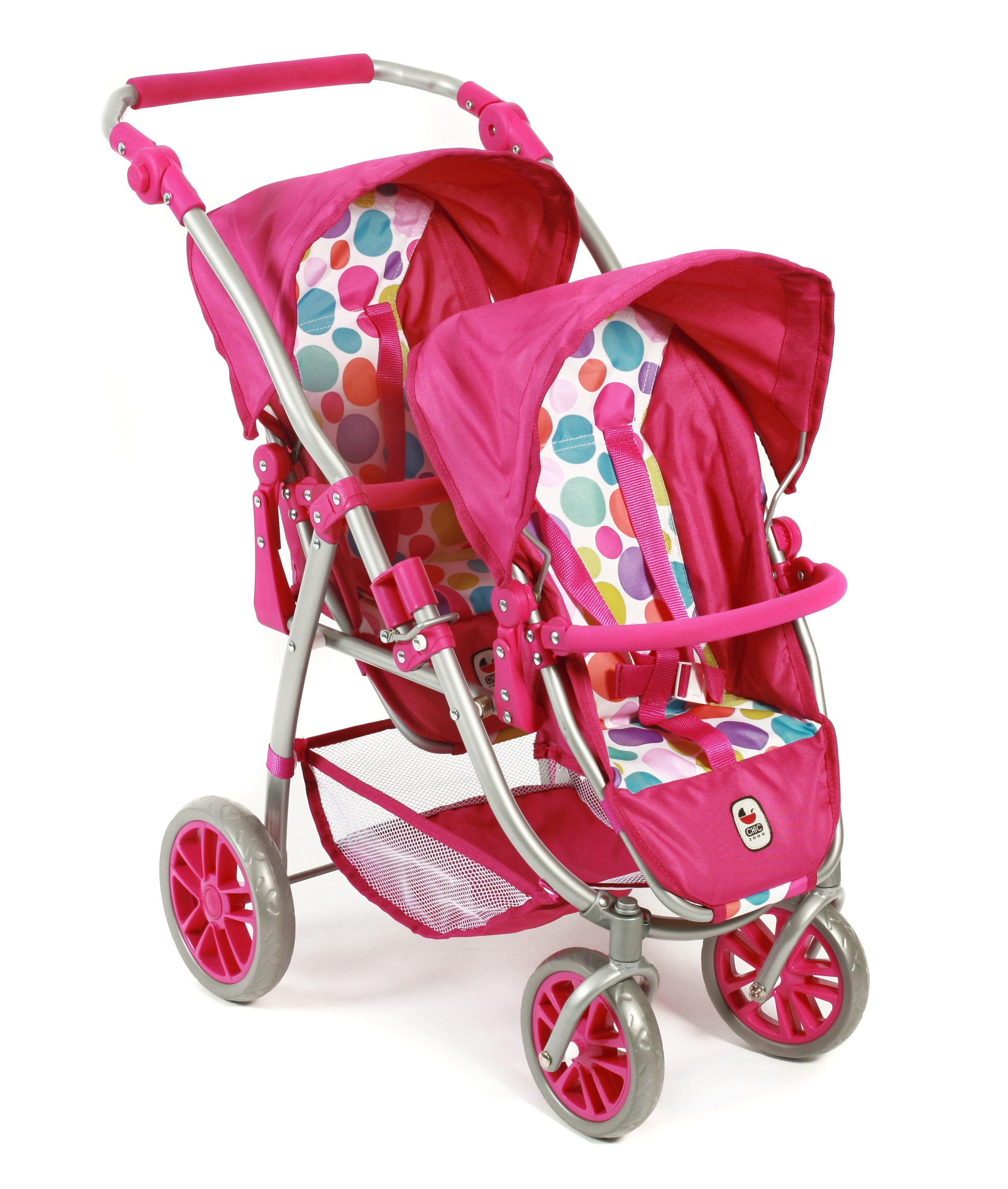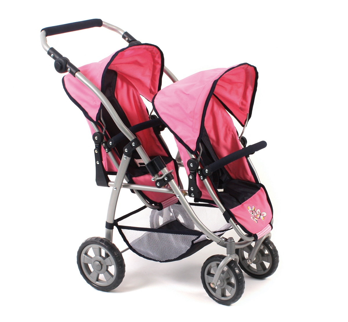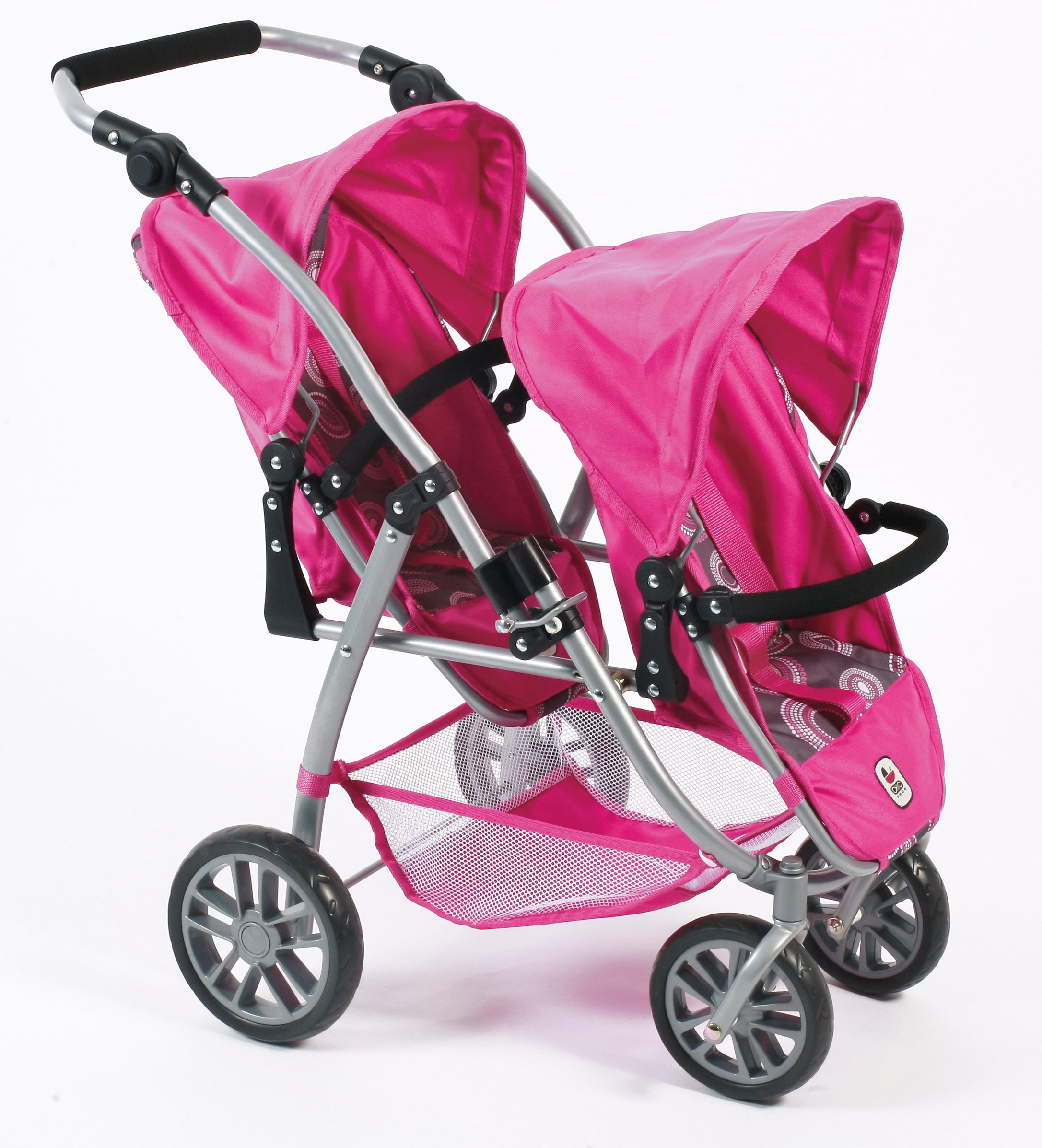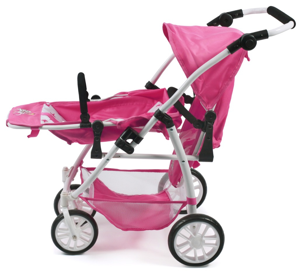 Kočárek je vybaven popruhy pro připoutání panenek, stříšku a pod kočárkem nákupní síť.