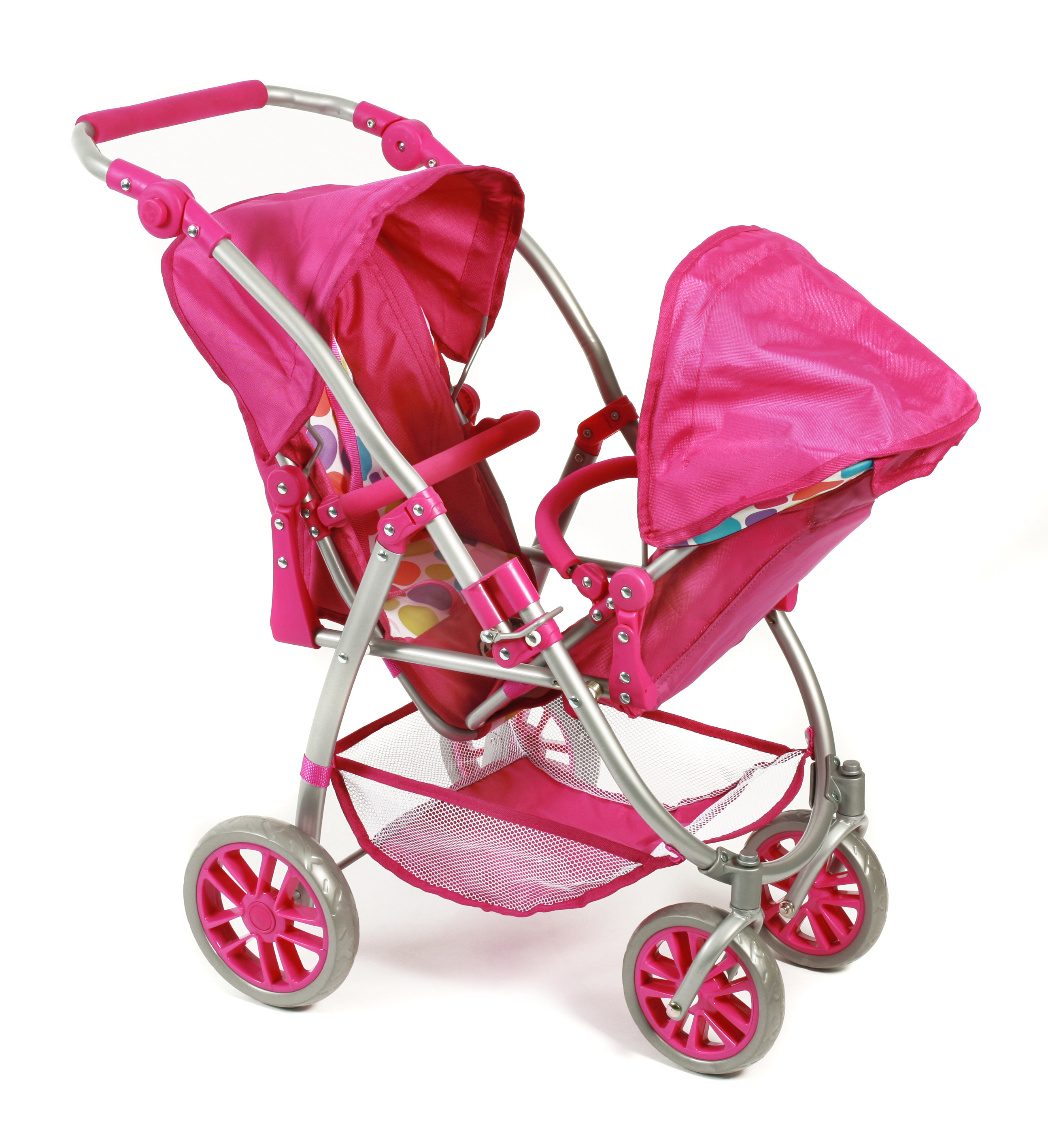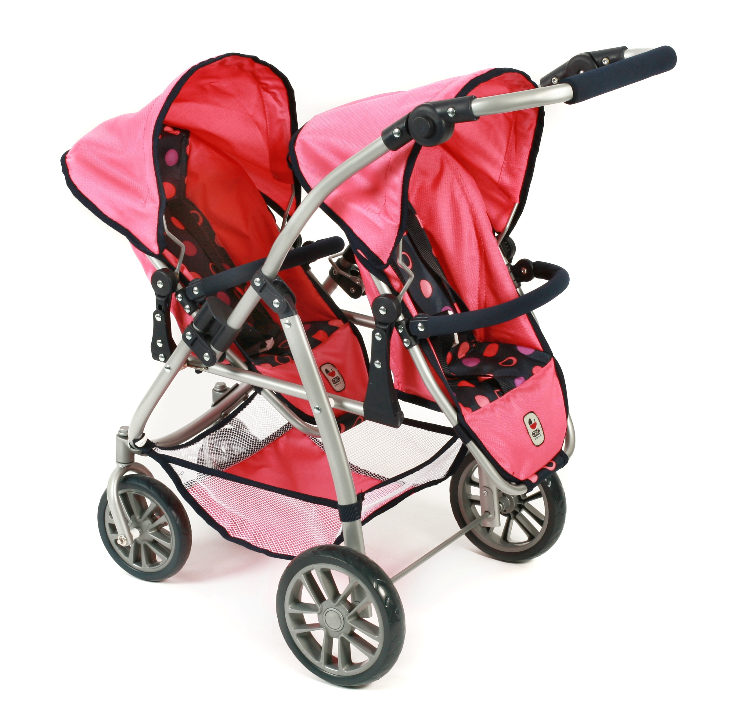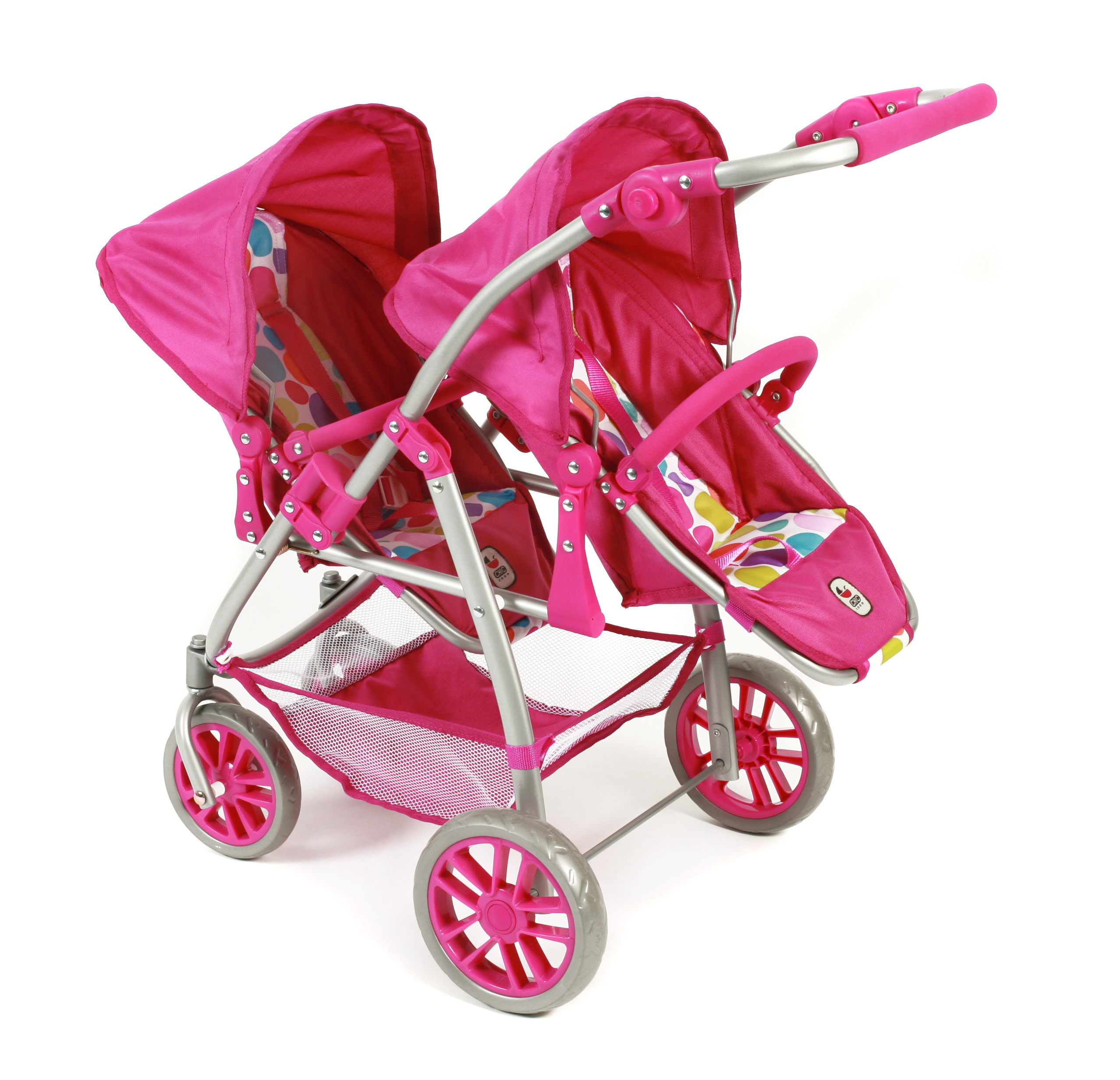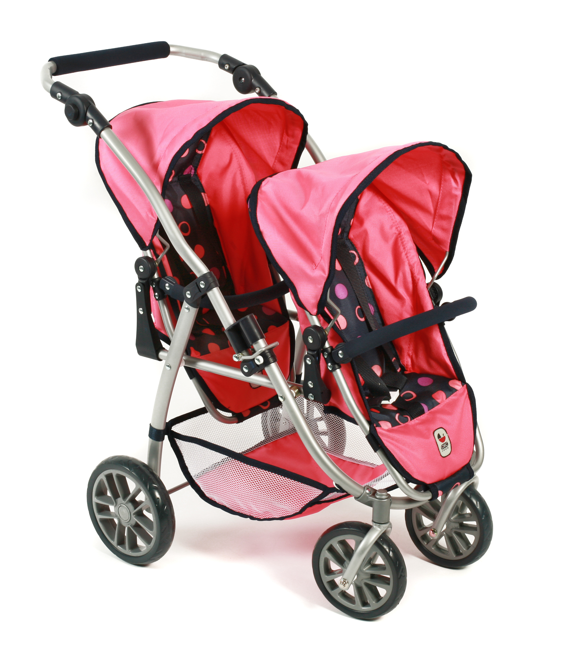 Kočárek je vybaven popruhy pro připoutání panenek, stříšku a pod kočárkem nákupní síť.