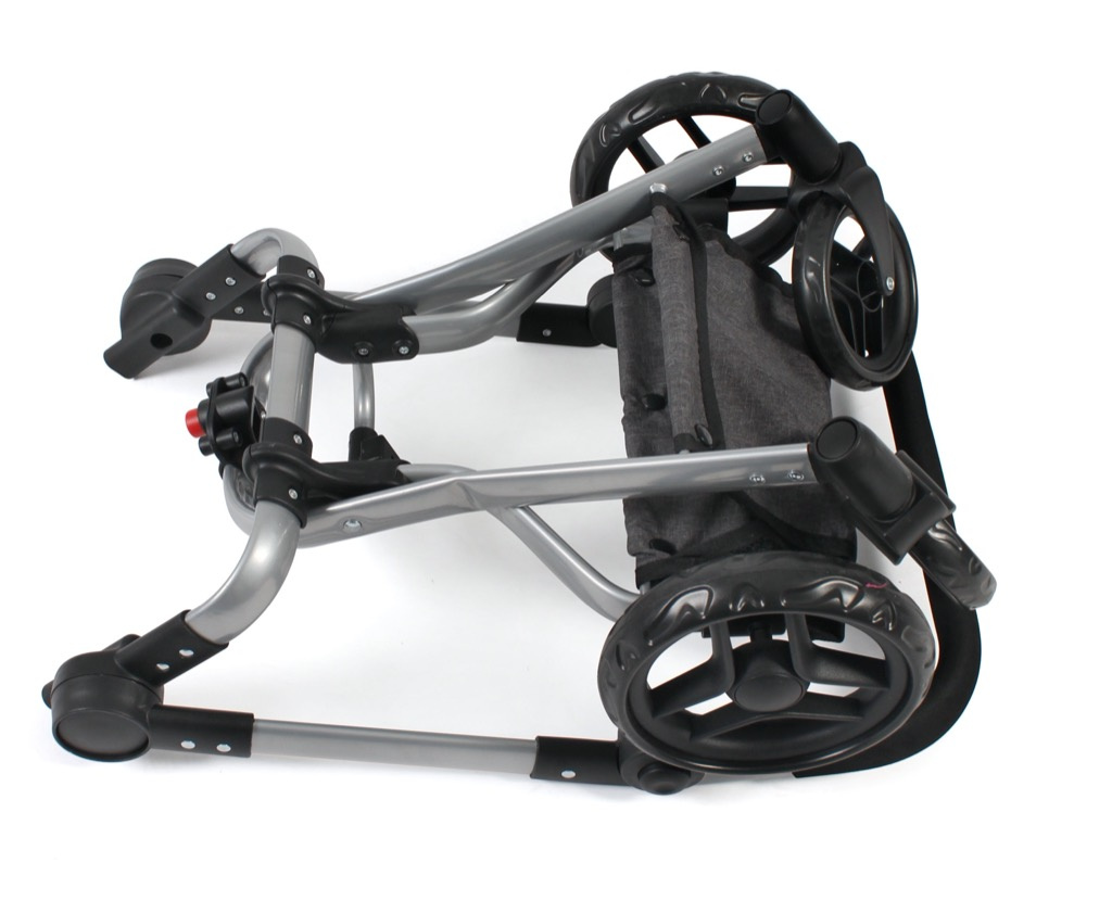 Na pevném podvozku, který má otočná 2 kolečka a 2 pevná je nasazená korbička, která se dá nasadit oběma směry po i proti směru jízdy.