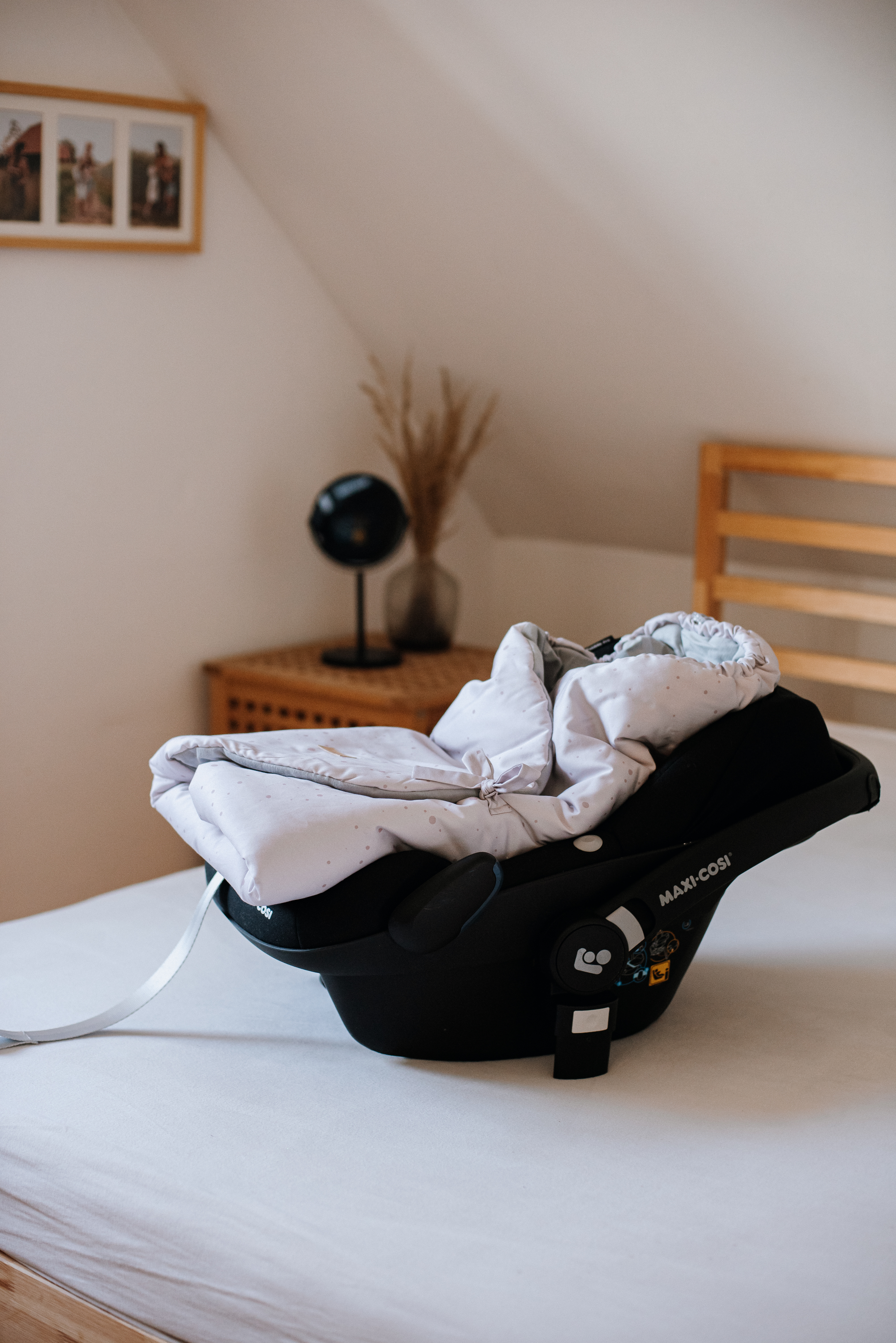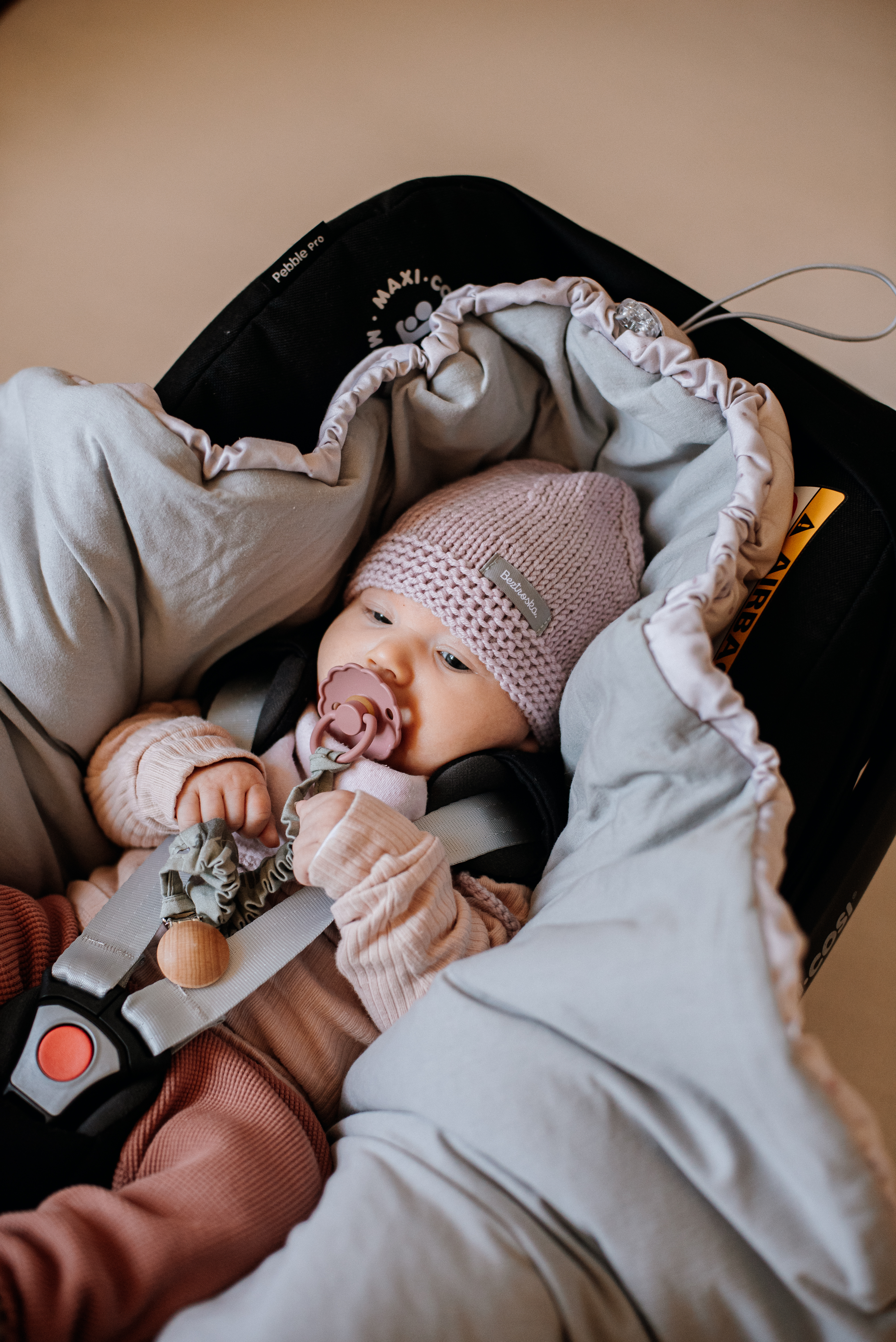 Měkká deka do autosedačky / nebo kočárku s otvory pro možné uchycení v jakékoli autosedačce (i s 5bodovými neoddělitelnými bezpečnostními pásy).