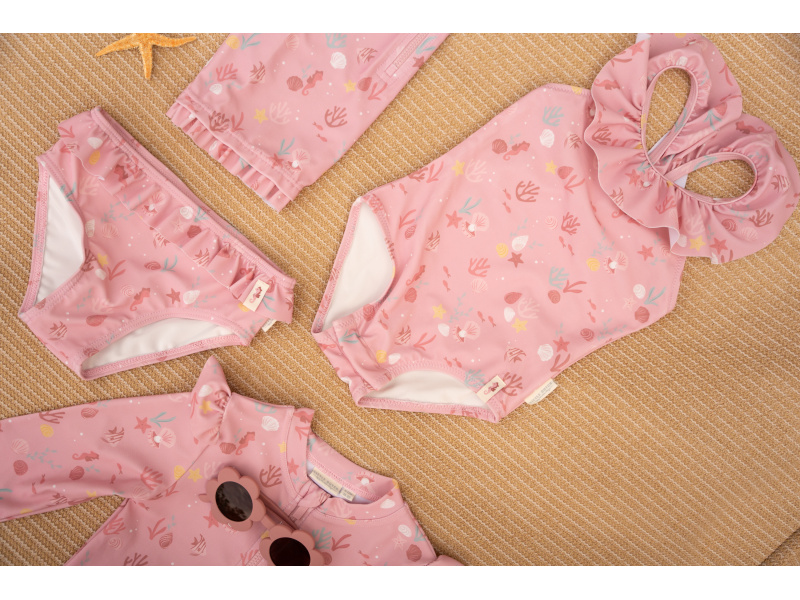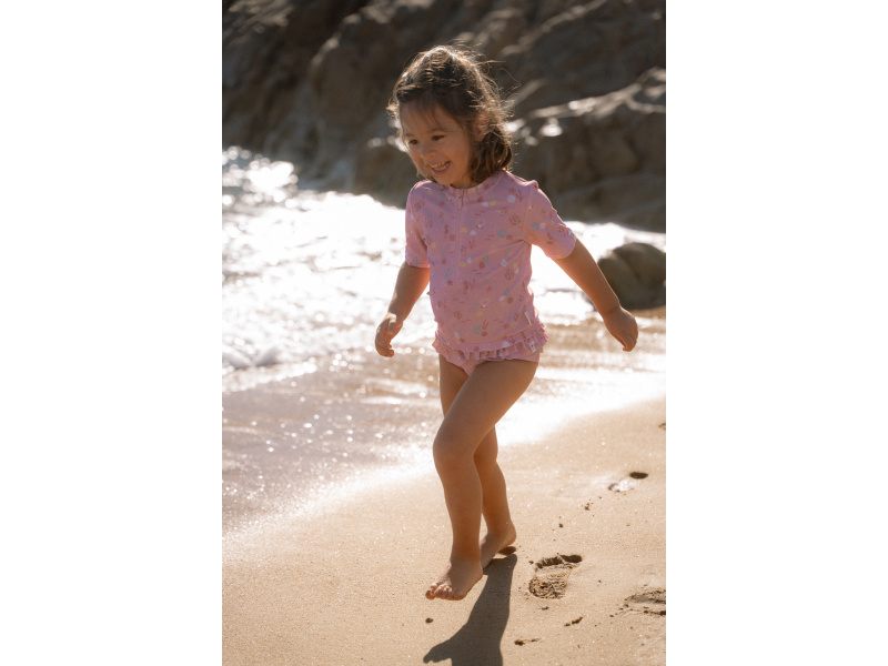 Plavky z UV ochranné tkaniny s krásným potiskem chrání vaše dítě před sluncem při koupání u moře i doma na zahradě. Ať už vaše děti milují skákání ve vlnách, koupání v bazénu nebo si rády staví hrady z písku, v těchto plavkách si mohou bezstarostně užívat celý den. Složení: 82% recyklovaný polyester, 18% elastan Ochranný faktor: UPF 50+ Při pobytu na slunci používejte pro dítě ochranné opalovací krémy. Možno prát v pračce na 30°C. Po každém použití plavky propláchněte v čisté studené vodě.