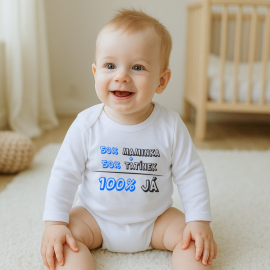 Originální bavlněné kojenecké body s dlouhým rukávem New Baby, s vtipným nápisem 50% MAMINKA + 50% TATÍNEK - 100% JÁ. Body má kolem krčku, nožiček a ručiček barevné lemování. Barvy použité k potisku jsou certifikované a vhodné pro miminka. Je vyrobeno z příjemného a kvalitního materiálu, ve kterém se bude Vaše miminko cítit příjemně. Body má zapínáni na cvočky na ramínku a mezi nožičkami, což usnadňuje oblékání a přebalování. Dopřejte Vašemu miminku vyniknout v originálním body. Složení: 100% bavlna. Rozměry: obvod kolem hrudníku cca 40 cm, délka rukávu cca 22 cm, celková délka cca 36 cm.