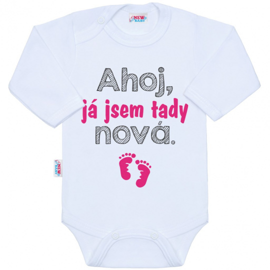 Originální bavlněné kojenecké body s dlouhým rukávem New Baby, s vtipným nápisem Ahoj, já jsem tady nová. Barvy použité k potisku jsou certifikované a vhodné pro miminka. Je vyrobeno z příjemného a kvalitního materiálu, ve kterém se bude Vaše miminko cítit příjemně. Body má zapínáni na cvočky na ramínku a mezi nožičkami, což usnadňuje oblékání a přebalování. Dopřejte Vašemu miminku vyniknout v originálním body. Složení: 100% bavlna. Rozmery: obvod okolo hrudníka cca 38 cm, dĺžka rukáva cca 21 cm, celková dĺžka cca 33 cm.