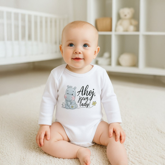 Originální bavlněné kojenecké body s dlouhým rukávem New Baby, s roztomilým obrázkem a nápisem Ahoj, jsem tady! Body má kolem krčku, nožiček a ručiček barevné lemování. Barvy použité k potisku jsou certifikované a vhodné pro miminka. Je vyrobeno z příjemného a kvalitního materiálu, ve kterém se bude Vaše miminko cítit příjemně. Body má zapínáni na cvočky na ramínku a mezi nožičkami, což usnadňuje oblékání a přebalování. Dopřejte Vašemu miminku vyniknout v originálním body. Složení: 100% bavlna. Rozměry: obvod kolem hrudníku cca 42 cm, délka rukávu cca 23 cm, celková délka cca 38 cm.