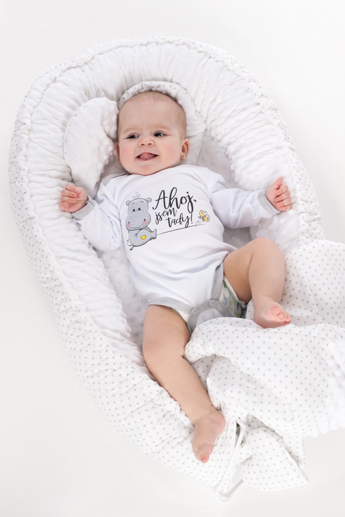 Originální bavlněné kojenecké body s dlouhým rukávem New Baby, s roztomilým obrázkem a nápisem Ahoj, jsem tady! Body má kolem krčku, nožiček a ručiček barevné lemování. Barvy použité k potisku jsou certifikované a vhodné pro miminka. Je vyrobeno z příjemného a kvalitního materiálu, ve kterém se bude Vaše miminko cítit příjemně. Body má zapínáni na cvočky na ramínku a mezi nožičkami, což usnadňuje oblékání a přebalování. Dopřejte Vašemu miminku vyniknout v originálním body. Složení: 100% bavlna. Rozměry: obvod kolem hrudníku cca 50 cm, délka rukávu cca 26 cm, celková délka cca 42 cm.