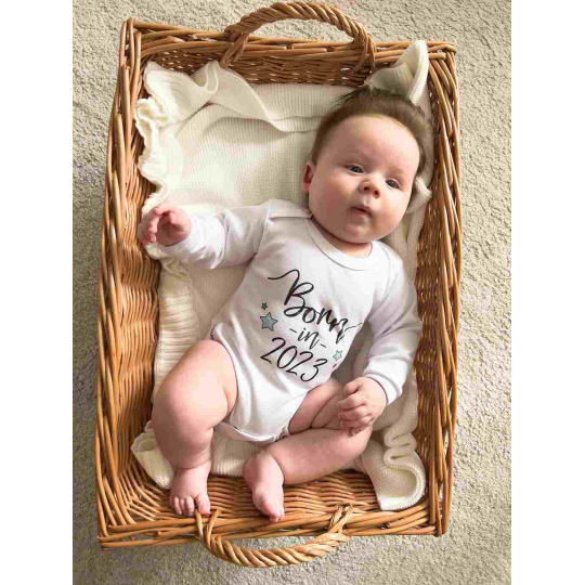 Originální bavlněné kojenecké body s dlouhým rukávem New Baby s nápisem Born in 2023. Barvy použité k potisku jsou certifikované a vhodné pro miminka. Je vyrobeno z příjemného a kvalitního materiálu, ve kterém se bude Vaše miminko cítit příjemně. Body má zapínáni na cvočky na ramínku a mezi nožičkami, což usnadňuje oblékání a přebalování. Dopřejte Vašemu miminku vyniknout v originálním body. Složení: 100% bavlna.