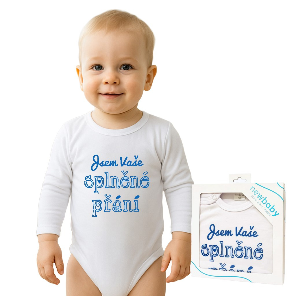 Originální bavlněné kojenecké body s dlouhým rukávem New Baby, s vtipným nápisem Jsem Vaše splněné přání. Barvy použité k potisku jsou certifikované a vhodné pro miminka. Je vyrobeno z příjemného a kvalitního materiálu, ve kterém se bude Vaše miminko cítit příjemně. Body má zapínáni na cvočky na ramínku a mezi nožičkami, což usnadňuje oblékání a přebalování. Dopřejte Vašemu miminku vyniknout v originálním body. Složení: 100% bavlna. Rozměry: obvod kolem hrudníku cca 50 cm, délka rukávu cca 26 cm, celková délka cca 42 cm.