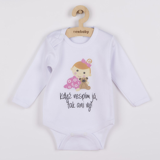 Originální bavlněné kojenecké body s dlouhým rukávem New Baby, s vtipným nápisem Když nespím já, tak ani vy! A obrázkem roztomilé holčičky. Body má kolem krčku, nožiček a ručiček barevné lemování. Barvy použité k potisku jsou certifikované a vhodné pro miminka. Je vyrobeno z příjemného a kvalitního materiálu, ve kterém se bude Vaše miminko cítit příjemně. Body má zapínáni na cvočky na ramínku a mezi nožičkami, což usnadňuje oblékání a přebalování. Dopřejte Vašemu miminku vyniknout v originálním body. Složení: 100% bavlna. Rozměry: obvod kolem hrudníku cca 42 cm, délka rukávu cca 23 cm, celková délka cca 38 cm.