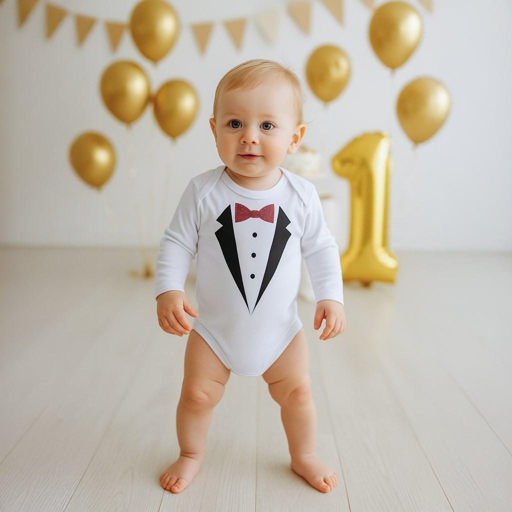 Originální bavlněné kojenecké body s dlouhým rukávem New Baby, s obrázkem smokingu. Barvy použité k potisku jsou certifikované a vhodné pro miminka. Je vyrobeno z příjemného a kvalitního materiálu, ve kterém se bude Vaše miminko cítit příjemně. Body má zapínáni na cvočky na ramínku a mezi nožičkami, což usnadňuje oblékání a přebalování. Dopřejte Vašemu miminku vyniknout v originálním body. Složení: 100% bavlna. Rozměry: obvod kolem hrudníku cca 40 cm, délka rukávu cca 22 cm, celková délka cca 36 cm.