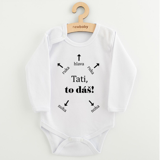 Originální bavlněné kojenecké body s dlouhým rukávem New Baby, s vtipným nápisem Tati, to dáš! Barvy použité k potisku jsou certifikované a vhodné pro miminka. Je vyrobeno z příjemného a kvalitního materiálu, ve kterém se bude Vaše miminko cítit příjemně. Body má zapínáni na cvočky na ramínku a mezi nožičkami, což usnadňuje oblékání a přebalování. Dopřejte Vašemu miminku vyniknout v originálním body. Složení: 100% bavlna. Rozměry: obvod kolem hrudníku cca 40 cm, délka rukávu cca 22 cm, celková délka cca 36 cm.