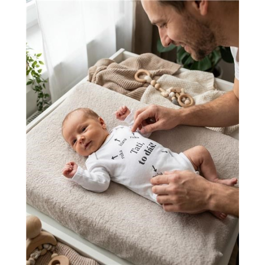 Originální bavlněné kojenecké body s dlouhým rukávem New Baby, s vtipným nápisem Tati, to dáš! Barvy použité k potisku jsou certifikované a vhodné pro miminka. Je vyrobeno z příjemného a kvalitního materiálu, ve kterém se bude Vaše miminko cítit příjemně. Body má zapínáni na cvočky na ramínku a mezi nožičkami, což usnadňuje oblékání a přebalování. Dopřejte Vašemu miminku vyniknout v originálním body. Složení: 100% bavlna. Rozměry: obvod kolem hrudníku cca 42 cm, délka rukávu cca 23 cm, celková délka cca 38 cm.