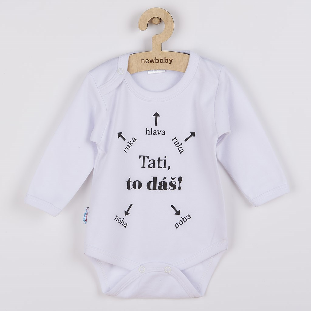 Originální bavlněné kojenecké body s dlouhým rukávem New Baby, s vtipným nápisem Tati, to dáš! Barvy použité k potisku jsou certifikované a vhodné pro miminka. Je vyrobeno z příjemného a kvalitního materiálu, ve kterém se bude Vaše miminko cítit příjemně. Body má zapínáni na cvočky na ramínku a mezi nožičkami, což usnadňuje oblékání a přebalování. Dopřejte Vašemu miminku vyniknout v originálním body. Složení: 100% bavlna. Rozměry: obvod kolem hrudníku cca 42 cm, délka rukávu cca 23 cm, celková délka cca 38 cm.