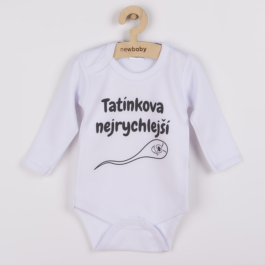 Originální bavlněné kojenecké body s dlouhým rukávem New Baby, s vtipným nápisem TATÍNKOVA NEJRYCHLEJŠÍ. Barvy použité k potisku jsou certifikované a vhodné pro miminka. Je vyrobeno z příjemného a kvalitního materiálu, ve kterém se bude Vaše miminko cítit příjemně. Body má zapínáni na cvočky na ramínku a mezi nožičkami, což usnadňuje oblékání a přebalování. Dopřejte Vašemu miminku vyniknout v originálním body. Složení: 100% bavlna. Rozměry: obvod kolem hrudníku cca 46 cm, délka rukávu cca 24 cm, celková délka cca 40 cm.