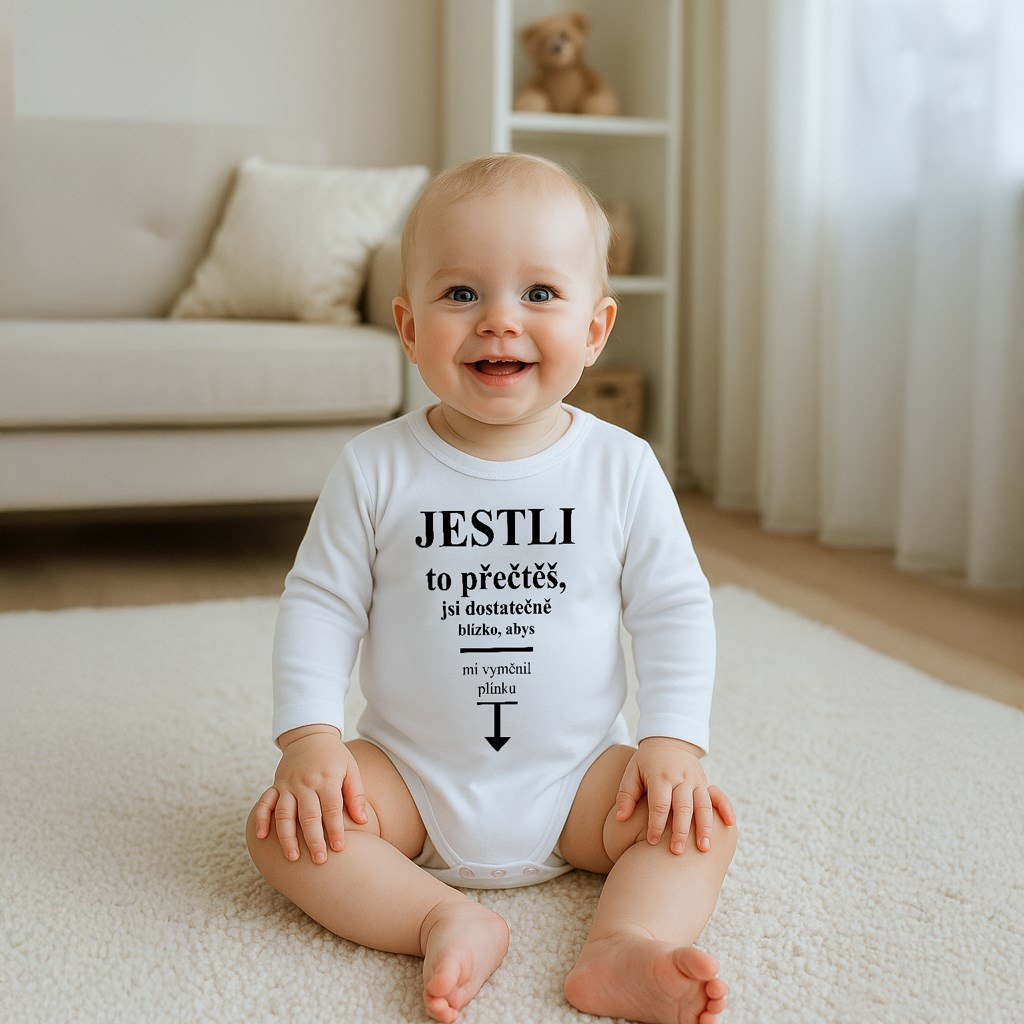 Originální bavlněné kojenecké body s dlouhým rukávem New Baby, s vtipným nápisem JESTLI to přečteš, jsi dostatečne blízko, abys mi vyměnil plínku. Barvy použité k potisku jsou certifikované a vhodné pro miminka. Je vyrobeno z příjemného a kvalitního materiálu, ve kterém se bude Vaše miminko cítit příjemně. Body má zapínáni na cvočky na ramínku a mezi nožičkami, což usnadňuje oblékání a přebalování. Dopřejte Vašemu miminku vyniknout v originálním body. Složení: 100% bavlna. Rozměry: obvod kolem hrudníku cca 34 cm, délka rukávu cca 16 cm, celková délka cca 30 cm.