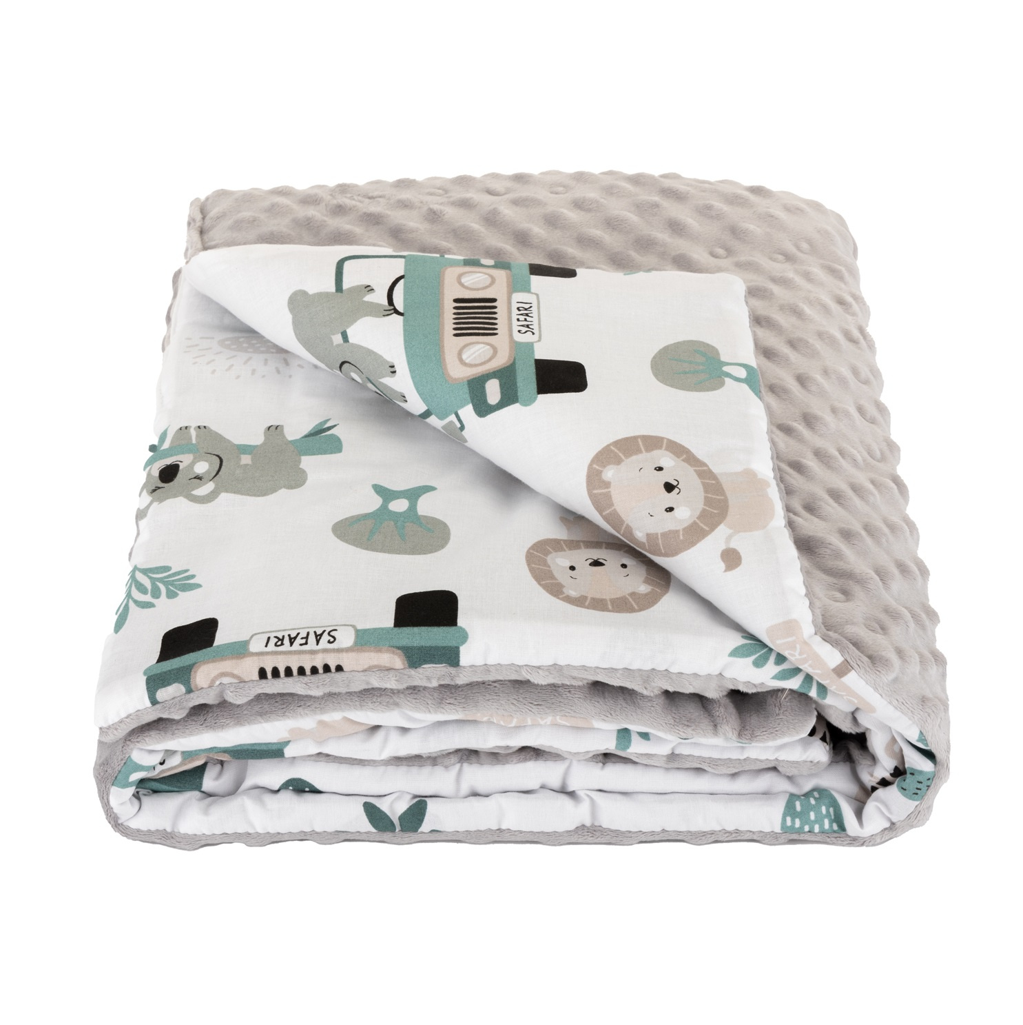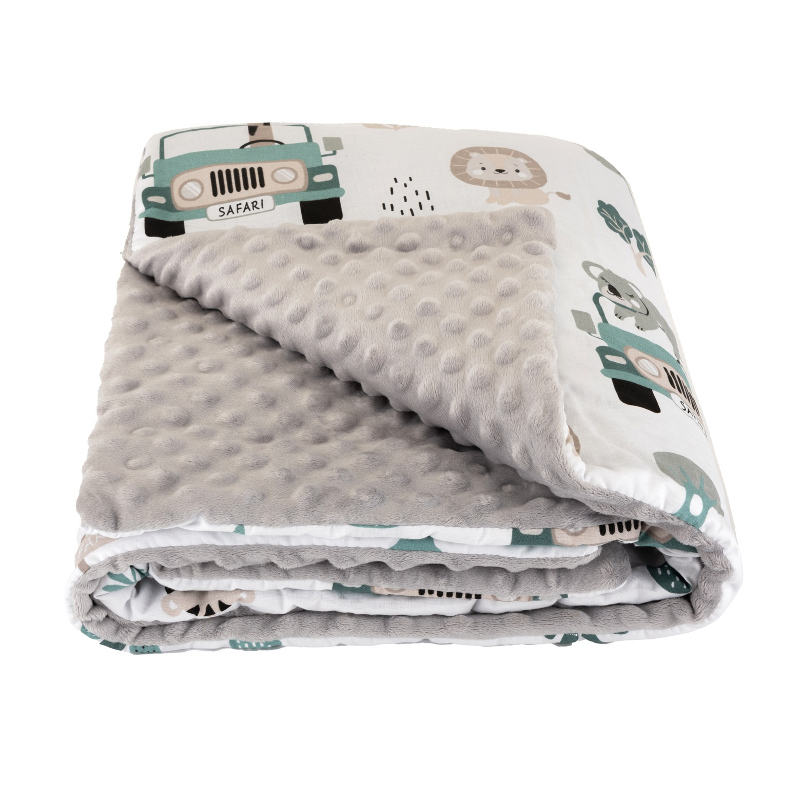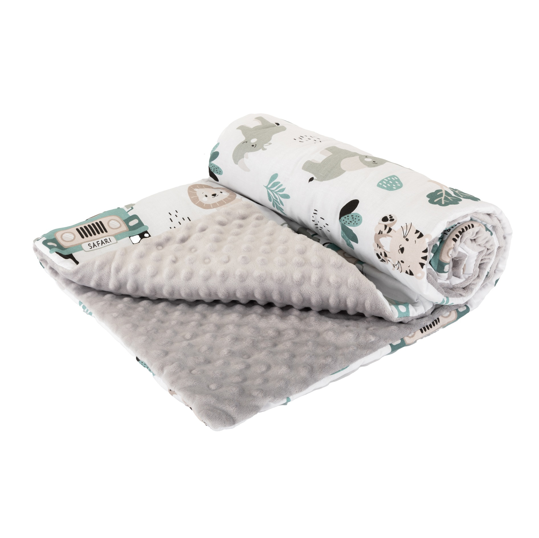 Dětská luxusní oboustranná deka vyrobena z jedné strany ze 100% bavlny a z druhé z jemného, hřejivého a luxusního materiálu MINKY. Měkoučká deka je pro větší pohodlí s výplní z antialergického polyesterového vlákna.