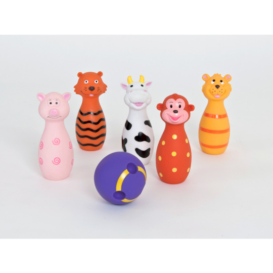 Roztomilá sada pěti kuželek ve tvaru zvířátek a koule s otvory jako pro opravdové hráče bowlingu. Vyrobeno z měkkého materiálu pro bezpečnou a příjemnou hru. Zvířátka Ludi po zmáčknutí pískají. Vhodné od 10 měsíců.