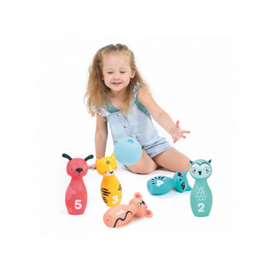 Sada obsahuje pět kuželek ve tvaru zvířátek s čísly a kouli s otvory na uchopení jako pro opravdové hráče bowlingu. Kuželky jsou vyrobené z měkkého materiálu pro bezpečnou a příjemnou hru a po zmáčknutí pískají. Vhodné od 10 měsíců.
