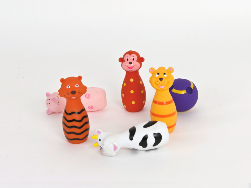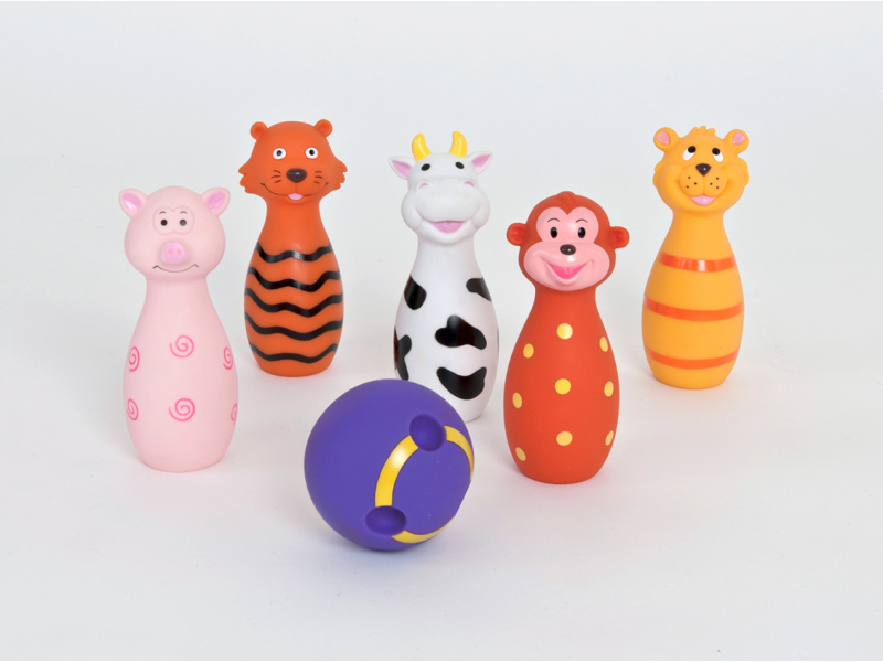 Roztomilá sada pěti kuželek ve tvaru zvířátek a koule s otvory jako pro opravdové hráče bowlingu. Vyrobeno z měkkého materiálu pro bezpečnou a příjemnou hru. Zvířátka Ludi po zmáčknutí pískají. Vhodné od 10 měsíců.