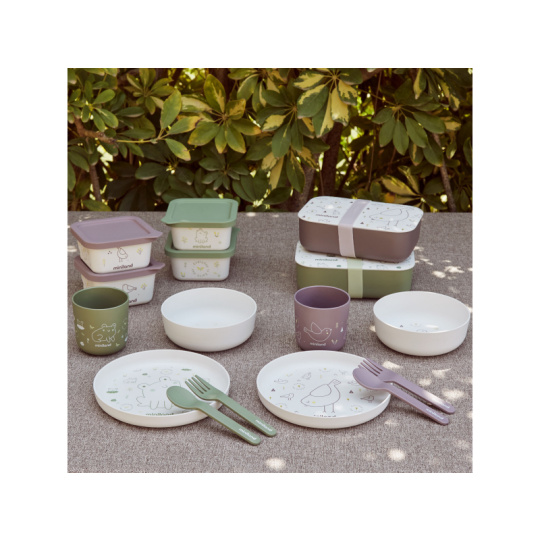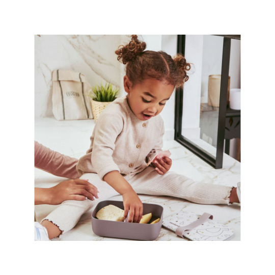 Box na svačinku s krásným potiskem je vyroben z materiálu 100% přírodního původu (PLA). Vnitřní silikonový oddělovač umožňuje oddělené uložení dvou částí dětské svačinky. Oddělovač je vyjímatelný a je možné jej vložit na jakékoli místo uvnitř boxu podle vaší potřeby. Hermetické víčko a silikonový pásek chrání obsah boxu a pomáhá udržet potraviny uvnitř boxu déle čerstvé. Box je vhodný do myčky, lednice i mrazáku. Není určen pro ohřívání v mikrovlnné troubě. Složení: bioplast PLA, silikon Neobsahuje bisfenol A.