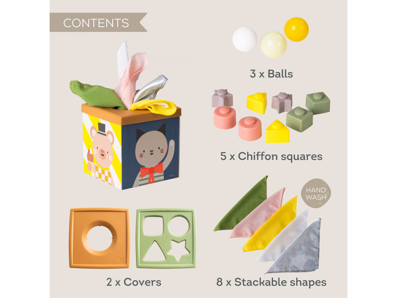 Multifunkční box s různorodými aktivitami je navržen tak, aby podněcoval dětskou zvědavost, podporoval samostatné hraní a rozvíjel jemnou motoriku i kognitivní dovednosti dítěte. Díky barevným šátkům, senzorickým míčkům a tvarům ke skládání si děti od 12 měsíců užijí hodiny smysluplné zábavy. Proč si hračku zamilujete: Tahání šátků - 5 barevných šifonových šátků pro objevování textur a podporu uchopování Senzorické míčky - 3 měkké míčky stimulují hmat i koordinaci pohybů malých ručiček Třídění a skládání tvarů - 8 různých tvarů rozvíjí logiku, jemnou motoriku a kreativitu Co rozvíjí: Kognitivní vývoj - třídění a skládání podporuje logické myšlení a řešení problémů Jemná motorika - uchopování šátků a skládání tvarů posiluje prsty a zápěstí Smyslové vnímání - barevné látky a texturované míčky podněcují zrak, hmat i koordinaci oko-ruka Samostatná hra - dítě se učí objevovat, experimentovat a hrát si nezávisle Společné hraní - ideální pro společný čas s rodiči – podporuje komunikaci a vztahové vazby Vhodné pro děti od 12 měsíců.