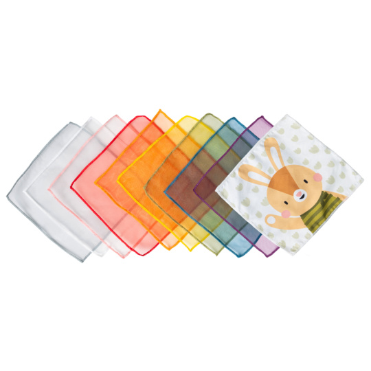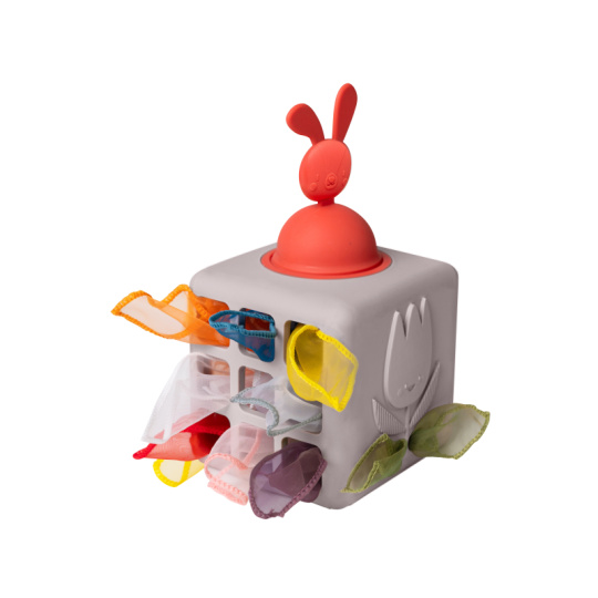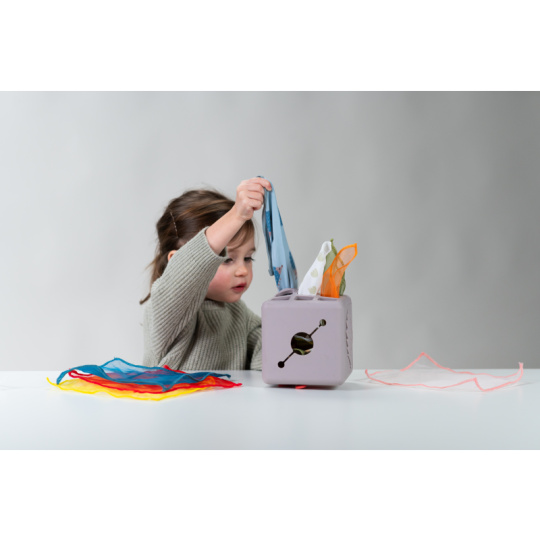 Originální hračka v podobě boxu s vytahovacími šátky a vyskakovacím králíčkem dítě zabaví a současně rozvíjí jeho jemnou motoriku a jednotlivé smysly. Box naplněný textilními šátky zajistí vašemu dítěti zábavu na dlouhé hodiny a zároveň podpoří rozvoj jeho smyslů i jemné motoriky. Dítě může šátky z boxu vytahovat a znovu je do něj vkládat, zkoumat jejich textury, ve starším věku pak poznávat jejich barvy, počítat je apod. Box vyrobený z jemného silikonu nabízí různé typy otvorů pro vytahování šátků, vyskakovacího králíčka a 3-D motivy ježka a květiny. Box obsahuje 10 šátků: 9 šátků různých barev z jemné organzy a 1 šátek s potiskem králíčka. Rozměry: 13,5 x 13,5 x 13,5 cm Vhodné pro děti od 12 měsíců.