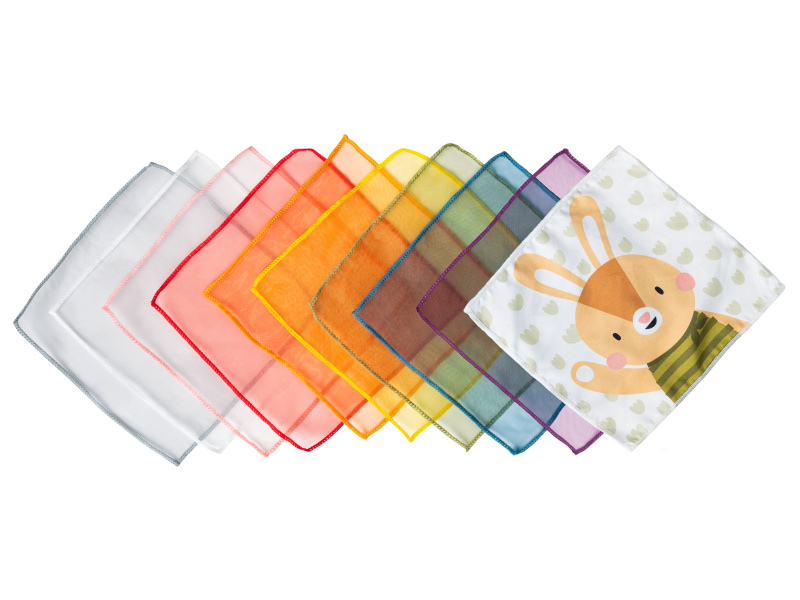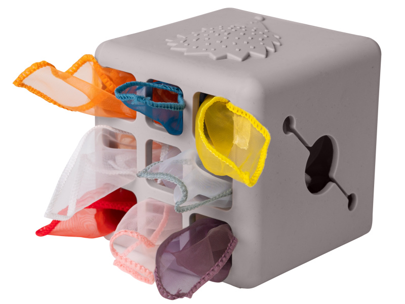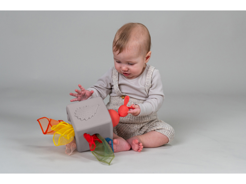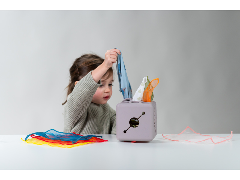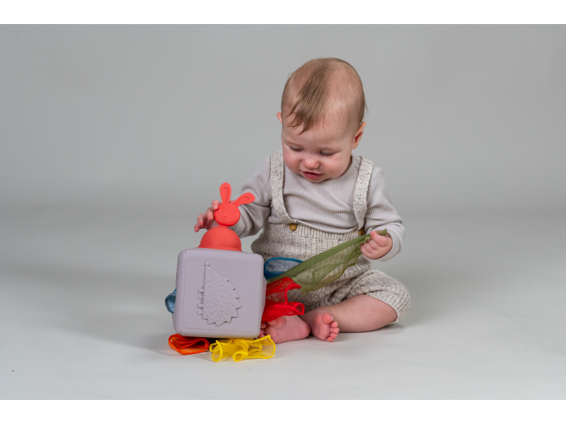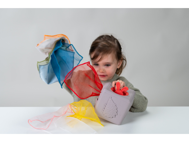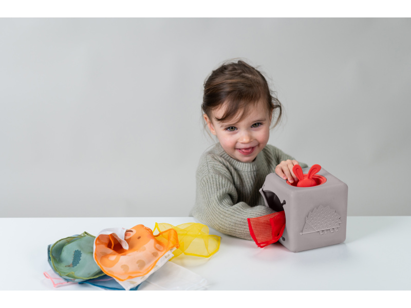 Originální hračka v podobě boxu s vytahovacími šátky a vyskakovacím králíčkem dítě zabaví a současně rozvíjí jeho jemnou motoriku a jednotlivé smysly. Box naplněný textilními šátky zajistí vašemu dítěti zábavu na dlouhé hodiny a zároveň podpoří rozvoj jeho smyslů i jemné motoriky. Dítě může šátky z boxu vytahovat a znovu je do něj vkládat, zkoumat jejich textury, ve starším věku pak poznávat jejich barvy, počítat je apod. Box vyrobený z jemného silikonu nabízí různé typy otvorů pro vytahování šátků, vyskakovacího králíčka a 3-D motivy ježka a květiny. Box obsahuje 10 šátků: 9 šátků různých barev z jemné organzy a 1 šátek s potiskem králíčka. Rozměry: 13,5 x 13,5 x 13,5 cm Vhodné pro děti od 12 měsíců.