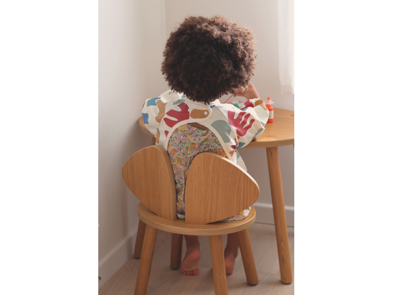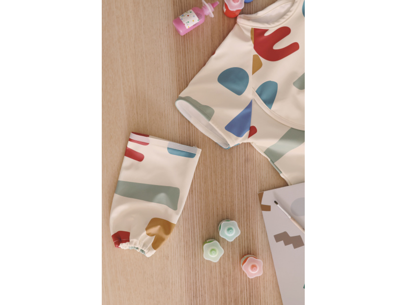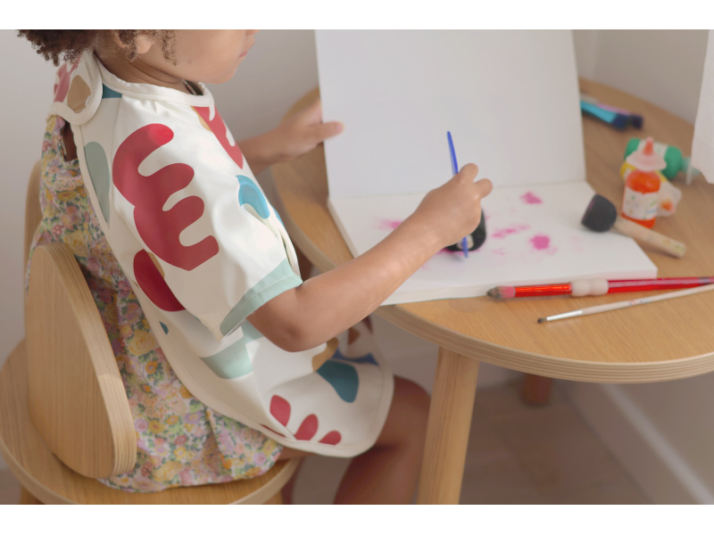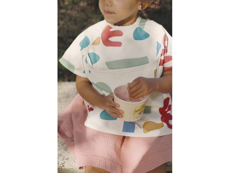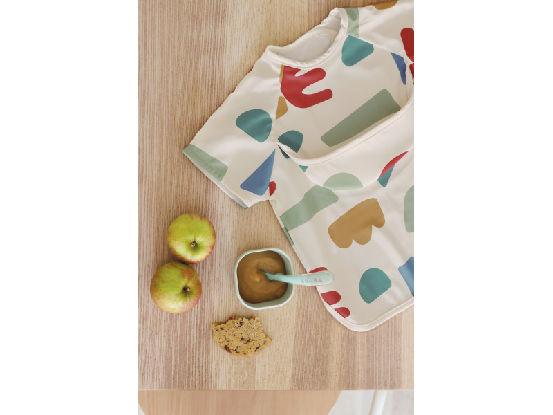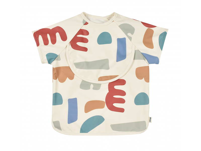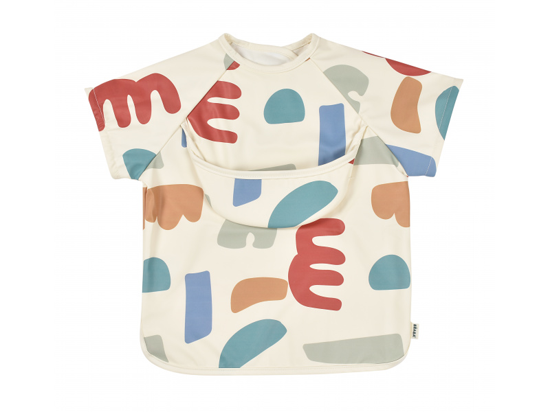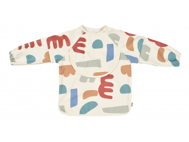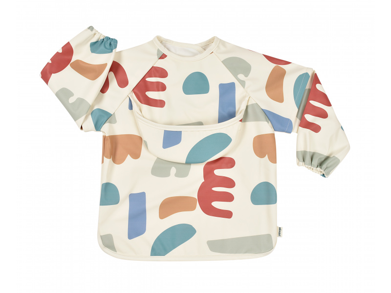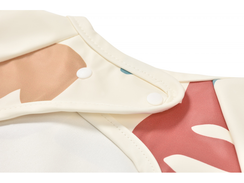 Bryndák s odnímatelnými rukávy chrání dětské oblečení při stolování i výtvarných aktivitách. Rukávy lze snadno oddělit i znovu přidělat. Rozkládací kapsa na přednní straně pomáhá zachytávat drobečky i kapky při dětském stolování, když kapsu např. při malování nepotřebujete, stačí ji nechat složenou. Nastavitelné zapínání na druky za krkem umožňuje snadné oblékání i přizpůsobení bryndáku velikosti dítěte. Elastické zakončení rukávů poskytuje pohodlí při nošení. Bryndák je vyroben z příjemného, měkkého materiálu, který při znečištění stačí otřít vlhkou houbičkou a je možné jej i prát v pračce. Vhodné pro děti od 4 měsíců do 4 let.
