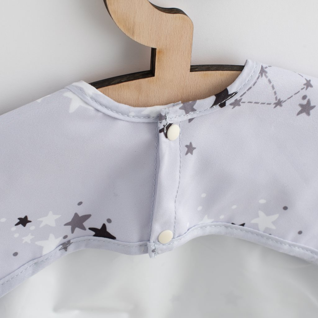 Dětský bryndák-zástěra s dlouhým rukávem New Baby účinně ochrání oblečení vašeho dítěte před ušpiněním při jídle a hraní. Vyrobeno z lehkého a měkkého materiálu. Bryndáček má pohodlné zapínání na 2 cvočky a praktickou kapsu. Bryndák je ušitý ze dvou vrstev materiálů. Spodní vrstva je z nepromokavého materiálu. Při zašpinění lze bryndák otřít vlhkým hadříkem, nebo prát v pračce.