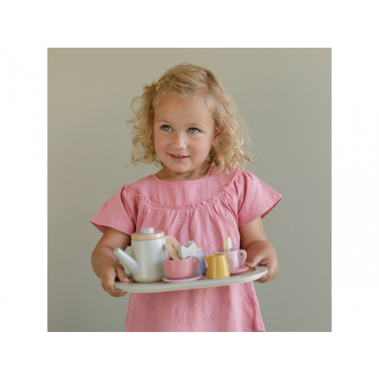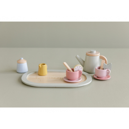 Dáte si čaj? S touto roztomilou dřevěnou čajovou soupravou může vaše ratolest podávat šálek lahodného čaje s mlékem, cukrem nebo plátkem citronu či snítkou máty. Máte všechny ingredience pro zábavné čajové odpoledne s přáteli. Obsah balení: dřevěná konvička s poklicí, konvička na mléko, cukřenka s pokličkou, tác, 2 šálky, 2 podšálky, 2 lžičky, 1 plátek citronu, 1 lístek máty Rozměry: 27,4 x 17,9 x 9 cm Vhodné pro děti od 2 let.
