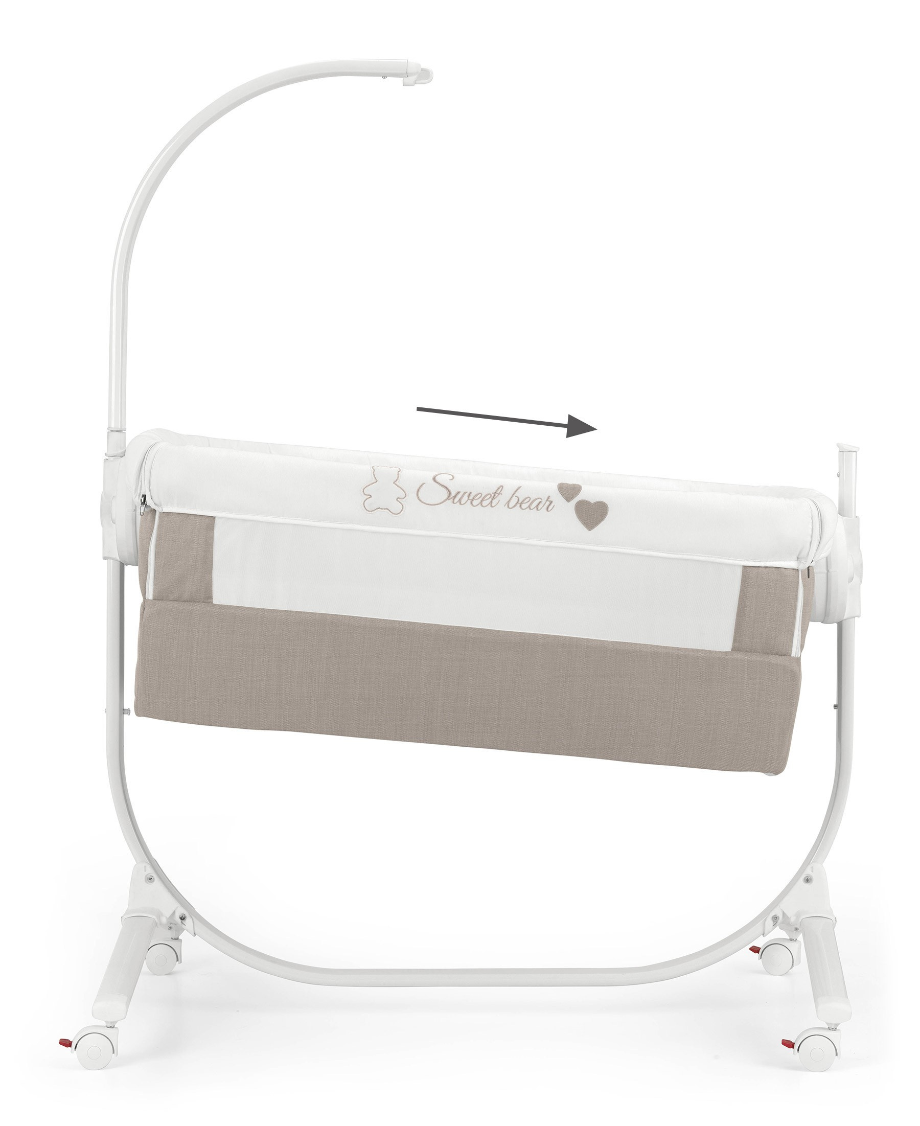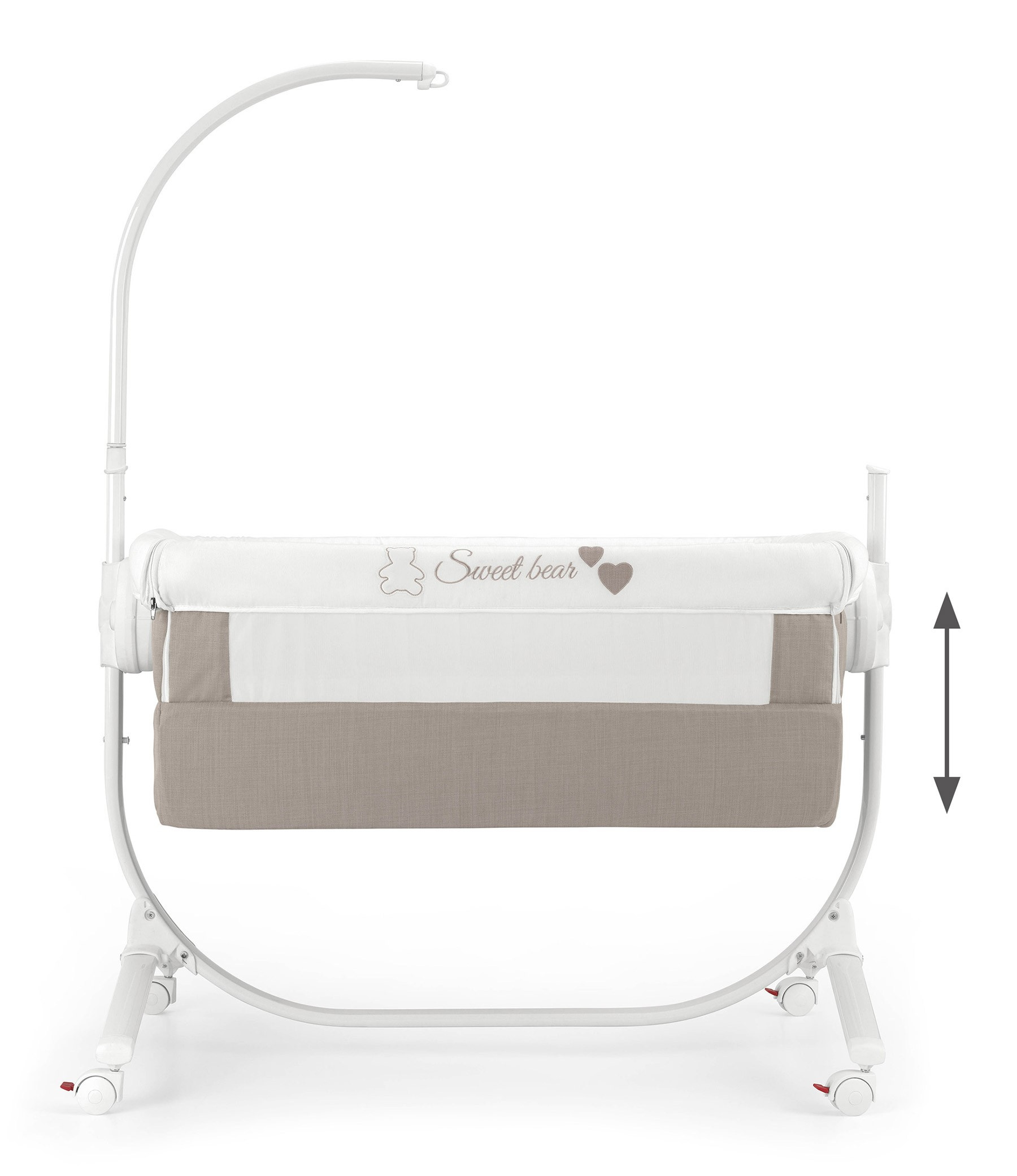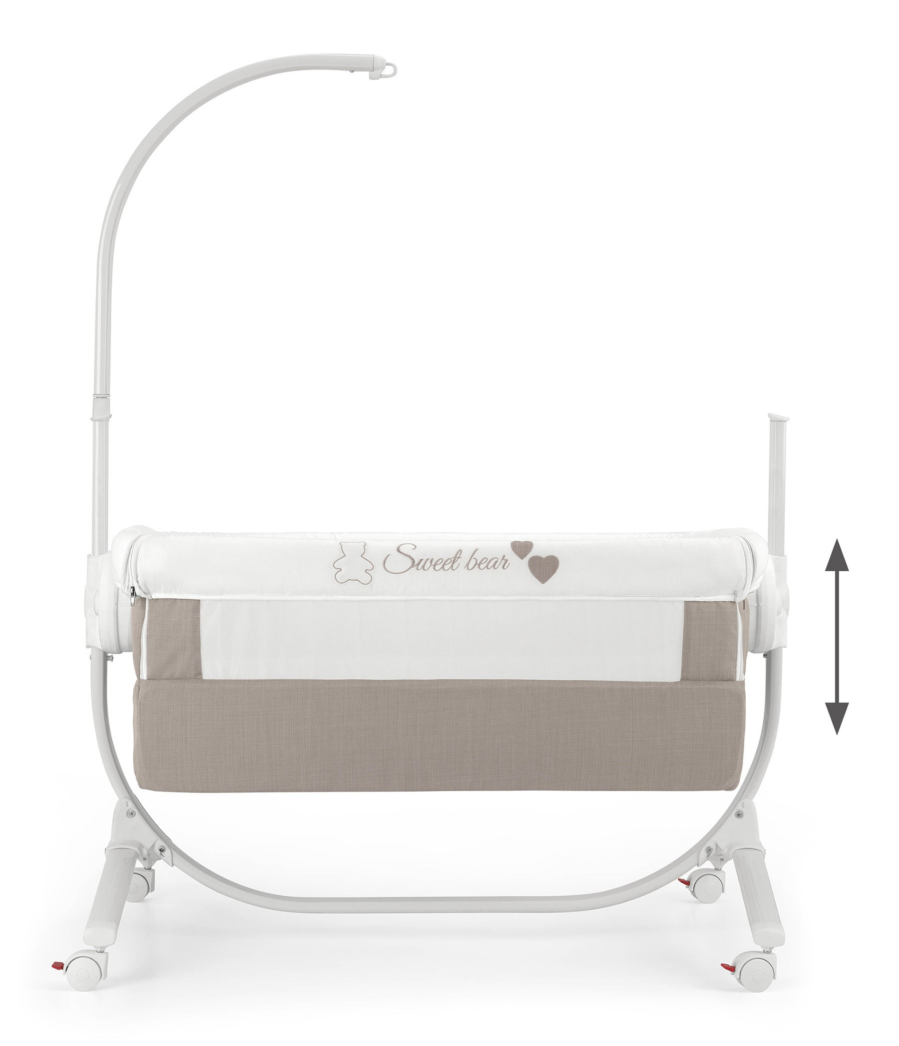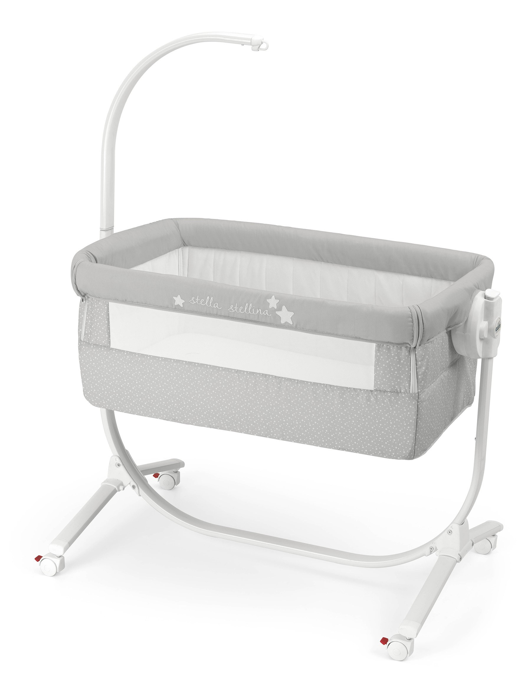 Je ukotvena v kovovém rámu, postýlku zle zajistit napevno nebo používat jako kolébku.