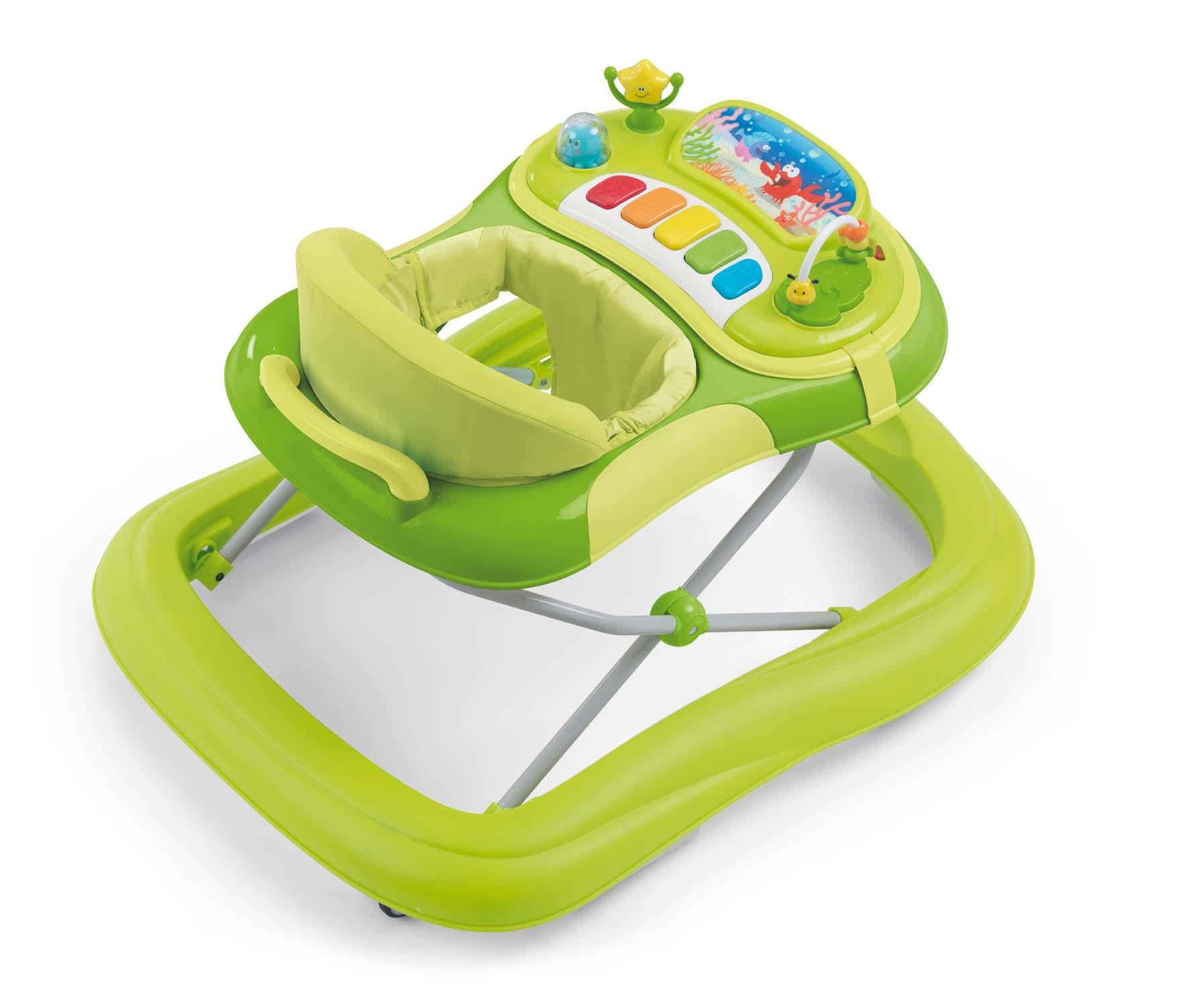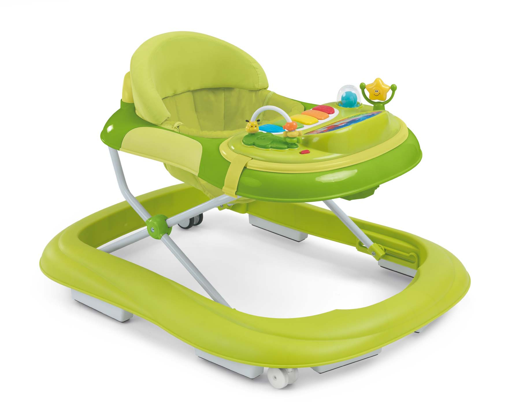 bezpečnostní mechanismus formou gumovým zárážek na podstavci jako prevence proti pádu ze schodů, 3 nastavitelné výšky, odnímatelný pultík s interaktivními aktivitami, světlýlka a melodie, textilní sedátko, napájeno bateriemi (2x AA baterie – 1,5V). Kompaktní skládání.