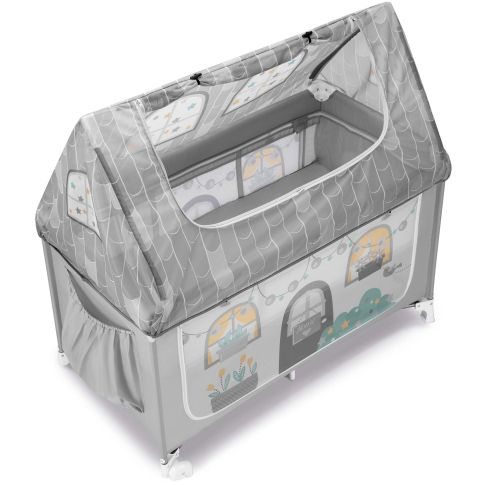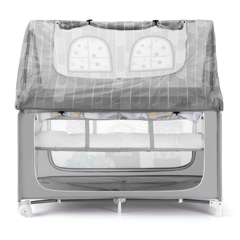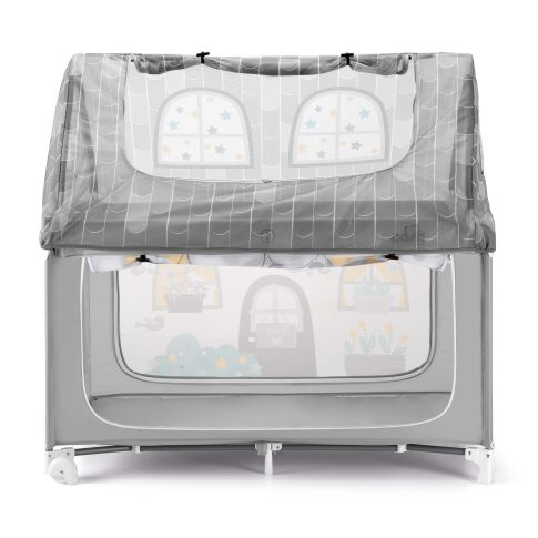 Další přístup k dítěti je skrze stříšku domečku, která se dá vyhrnout nahoru. Uvnitř postýlky je měkká komfortní matrace. Pro nejmenší děti, které zatím jen leží, lze zvednout spodek ohrádky do její poloviny.