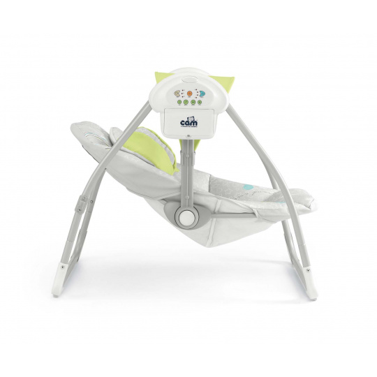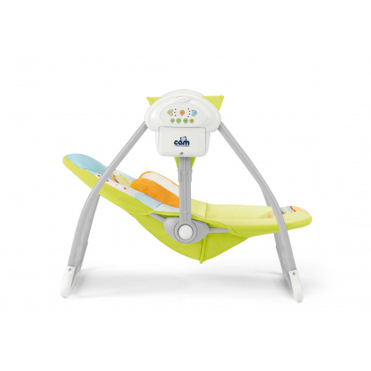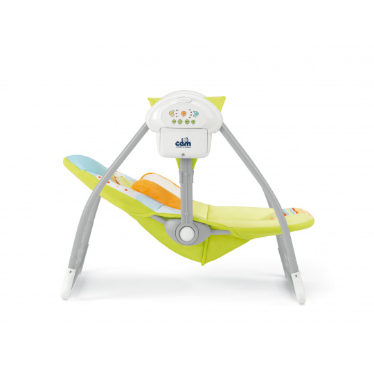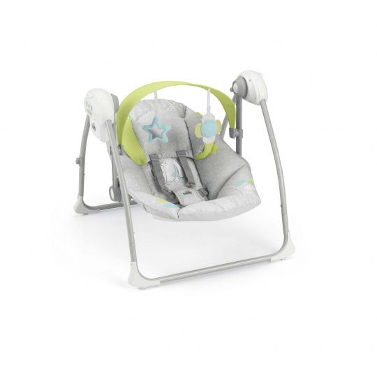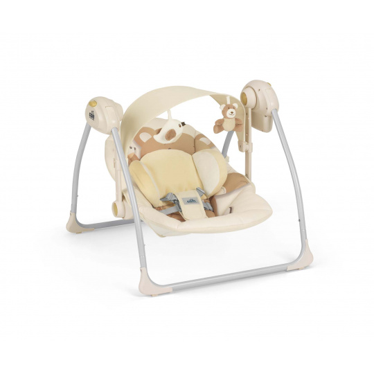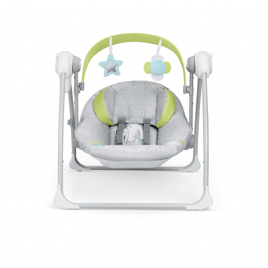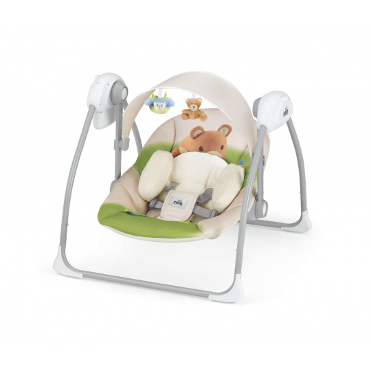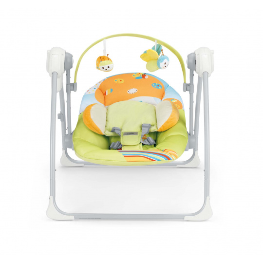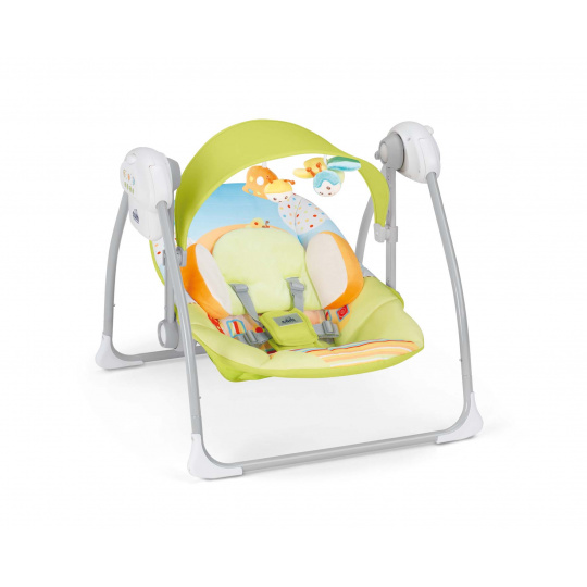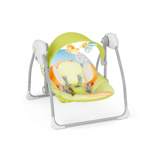 Nastavitelné opěradlo do 2 poloh, měkký látkový potah a opěrka/podložka hlavy, 5 ti bodový bezpečnostní pás, sluneční stříška s nastavitelnou výškou a s dvěmi plyšovými hračkami, nastavitelná výška, 3 nastavitelné rychlosti, automatické nastavení času vypnutí (po 10-20-30 min), 5 uklidňujících ukolébavek, 3 různé přírodní zvuky, nastavitelná hlastiost, napájení na baterie (4 x 1,5 V). Předvybaveno elektrickou zásuvkou. Kompaktní skládání. Dárkové balení.