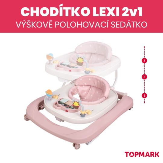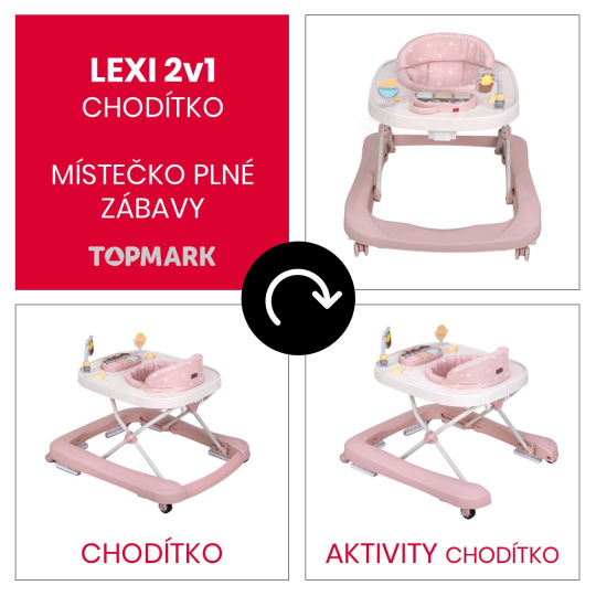 Hrací pultík obsahuje krásné veselé hračky, které rozvíjí koordinaci děťátka a rozveselí jej zvuky a světly. Chodítko je vybaveno kolečky a brzdičkami, které brání v převážení chodítka, jakmile se těžiště přesune na zadní kola. Jakmile vaše děťátko povyroste a začne dělat první krůčky je načase opustit chodítko a využít jeho druhou funkci, kdy po vyjmutí zadní tyče poskytuje chodítko podporu a mění se v AKTIVITY chodítko.