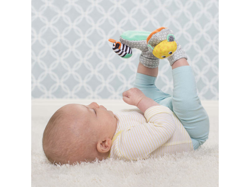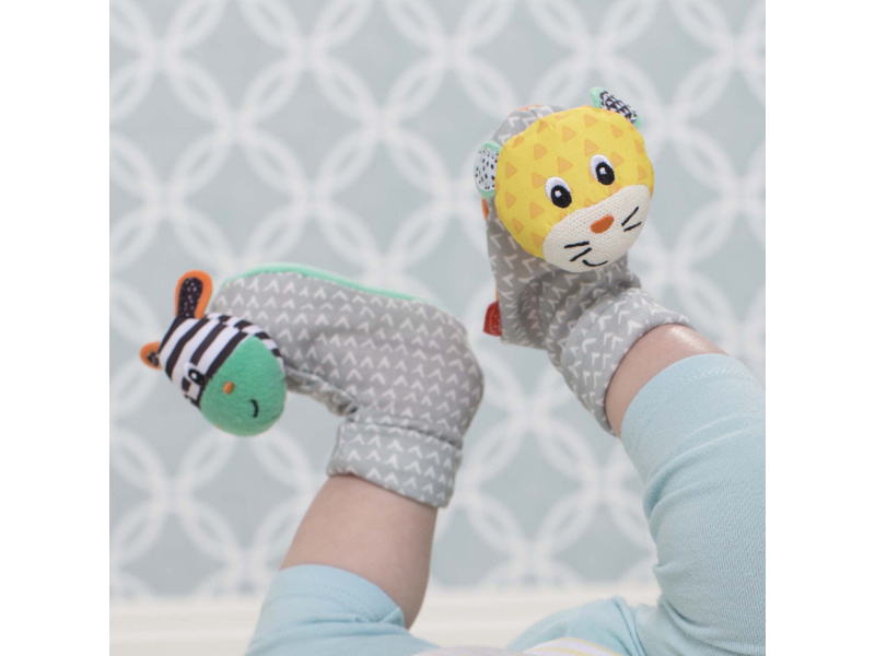 Navlékací bačkůrky s veselými obličeji tygříka a zebry podněcují rozvoj sluchu, zraku a hmatu dítěte. Dítě při kopání nožičkami sleduje a zkoumá pohybující se chrastící zvířátka. Balení / 2 ks. Vhodné pro děti od narození.
