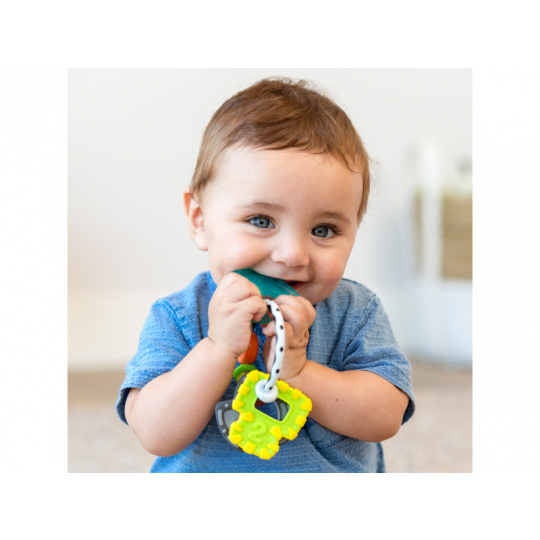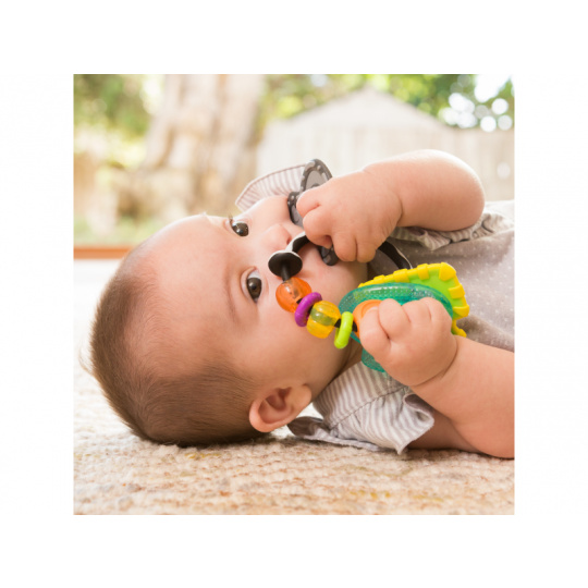 Chrastítko a kousátko ve výrazných barvách dítě zabaví i uleví jeho citlivým dásním při prořezávání zoubků. Tvar hračky umožňuje snadné uchopení dětskými ručičkami. Vhodné od narození.