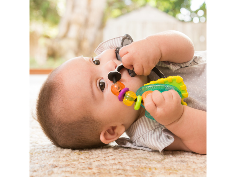 Chrastítko a kousátko ve výrazných barvách dítě zabaví i uleví jeho citlivým dásním při prořezávání zoubků. Tvar hračky umožňuje snadné uchopení dětskými ručičkami. Vhodné od narození.