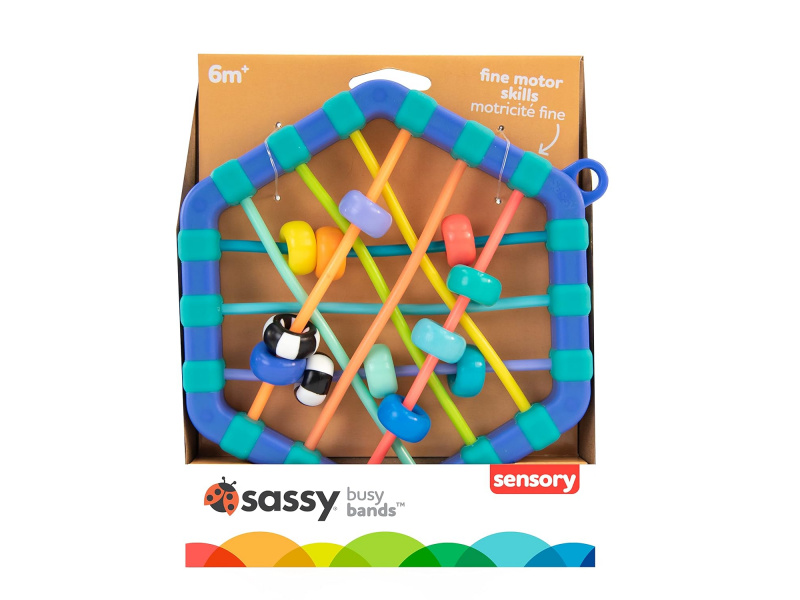 Originální chrastítko tvoří rámeček ve tvaru šestiúhelníku, ve kterém jsou natažena pružná vlákna s navlečenými pohyblivými korálky. Korálky je možné posunovat z jemné strany na druhou, rámeček hračky slouží i jako kousátko. Součástí hračky je i kroužek pro zavěšení na autosedačku či kočárek. Rozměry: 18 x 18 x 18 cm Vhodné pro děti od 6 měsíců.