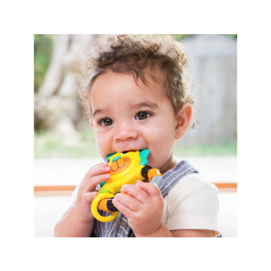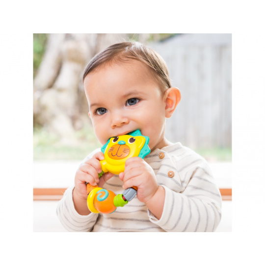 Bezpečné chrastítko a kousátko ve výrazných barvách dítě zabaví i uleví jeho citlivým dásním při prořezávání zoubků. Různorodé textury podněcují dítě ke zkoumání rukama i ústy. Tvar hračky umožňuje snadné uchopení dětskými ručičkami. Vhodné od narození.