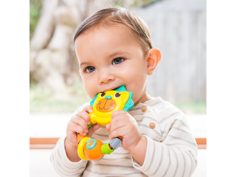 Bezpečné chrastítko a kousátko ve výrazných barvách dítě zabaví i uleví jeho citlivým dásním při prořezávání zoubků. Různorodé textury podněcují dítě ke zkoumání rukama i ústy. Tvar hračky umožňuje snadné uchopení dětskými ručičkami. Vhodné od narození.