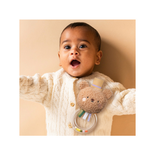 Chrastítko tvoří měkká plyšová hračka ve tvaru roztomilého medvídka Brendona a průhledný plastový kroužek naplněný barevnými korálky. Různé tvary a povrchy hračky podněcují dítě ke zkoumání rukama i ústy a pomáhají rozvíjet jemnou motoriku a smysly dítěte. Vhodné pro děti od narození.