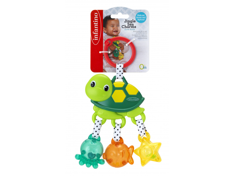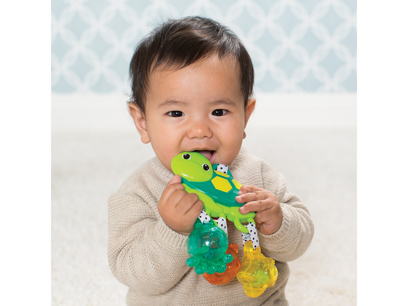 Roztomilá želva upoutá pozornost dítěte svými výraznými barvami a chrastěním při pohybu. Různorodé textury lákají dítě ke zkoumání. Hračku je možné zavěsit na autosedačku, kočárek či hrazdu na hrací dece. Vhodné pro děti od narození.