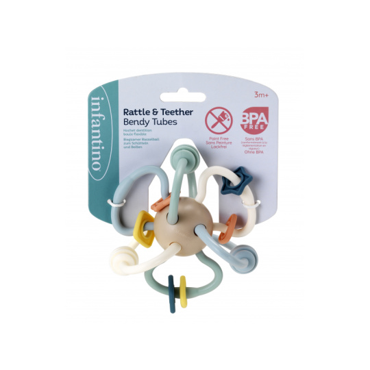 Chrastítko s kousátky Infantino láká miminko k objevování tvarů a textur. Hračka nabízí posuvné korálky a pružné smyčky, při pohybu jemně chrastí a funguje i jako kousátko, které pomáhá při prořezávání prvních zoubků dítěte. Tvar chrastítka je navržen pro snadné uchopení malými dětskými ručičkami. Chrastítko podporuje rozvoj jemné motoriky dítěte i jednotlivých smyslů. Vhodné pro děti od 3 měsíců.