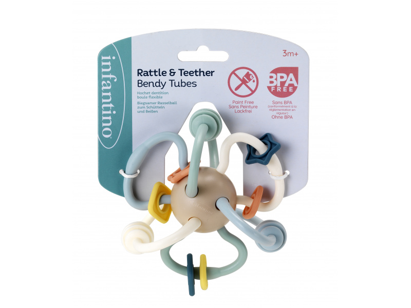 Chrastítko s kousátky Infantino láká miminko k objevování tvarů a textur. Hračka nabízí posuvné korálky a pružné smyčky, při pohybu jemně chrastí a funguje i jako kousátko, které pomáhá při prořezávání prvních zoubků dítěte. Tvar chrastítka je navržen pro snadné uchopení malými dětskými ručičkami. Chrastítko podporuje rozvoj jemné motoriky dítěte i jednotlivých smyslů. Vhodné pro děti od 3 měsíců.