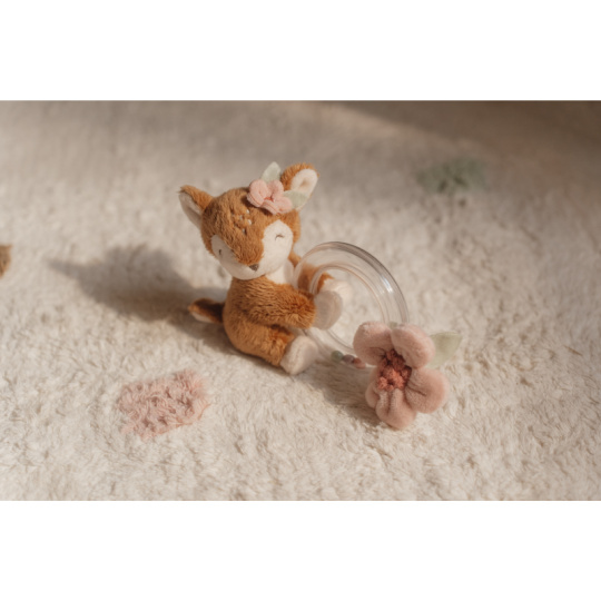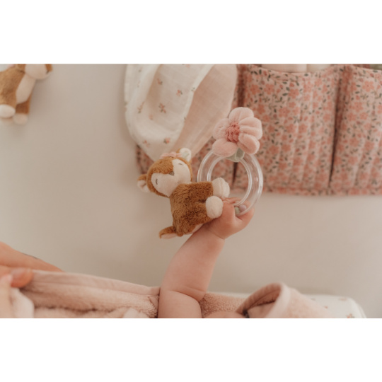 Originální chrastítko v podobě průhledného kroužku s chrasticími korálky a plyšovou srnkou a kytičkou je ideální jako první hračka pro vaše miminko. Chrastítko má tvar pro snadné uchopení a různorodé textury pro zkoumání rukama i ústy. Hračka je součástí designové kolekce hraček a doplňků Little Dutch Fairy Garden inspirované životem na zahradě. Rozměry: 14,5 x 11 x 6 cm Vhodné pro děti od narození.