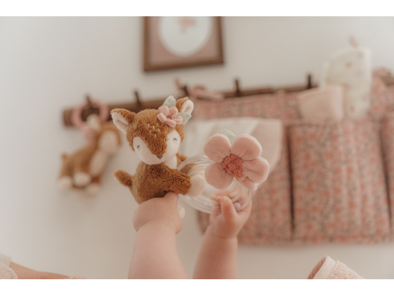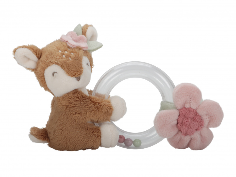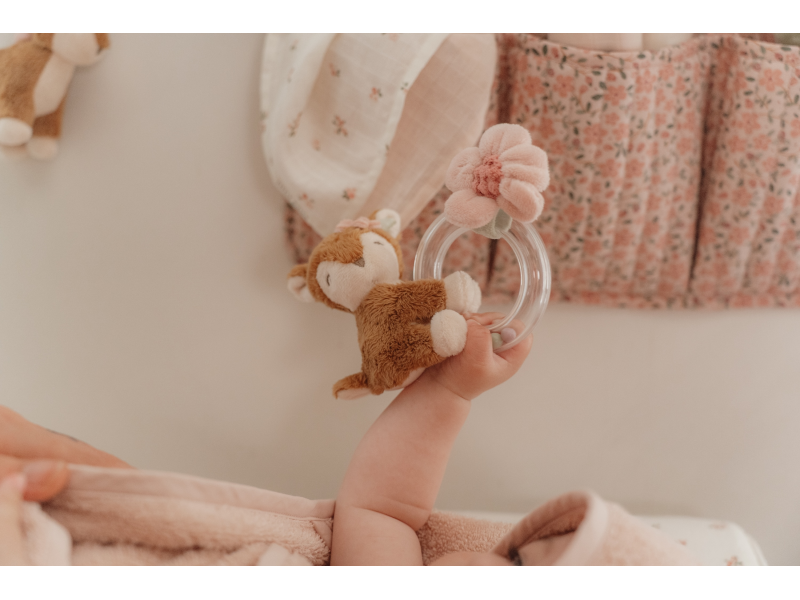 Originální chrastítko v podobě průhledného kroužku s chrasticími korálky a plyšovou srnkou a kytičkou je ideální jako první hračka pro vaše miminko. Chrastítko má tvar pro snadné uchopení a různorodé textury pro zkoumání rukama i ústy. Hračka je součástí designové kolekce hraček a doplňků Little Dutch Fairy Garden inspirované životem na zahradě. Rozměry: 14,5 x 11 x 6 cm Vhodné pro děti od narození.