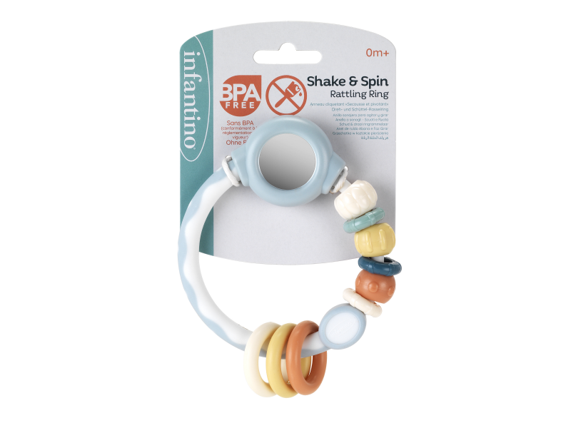 Lehké chrastítko Infantino zabaví vaše miminko doma i na cestách. Barevné kroužky se posouvají a otáčí, různé textury vybízí k prozkoumávání prstíky i v ústech. Nechybí ani bezpečné zrcátko, které přitáhne pozornost miminka. Hračka má tvar pro snadné uchopení malými dětskými ručičkami. Chrastítko podporuje rozvoj jemné motoriky dítěte i jednotlivých smyslů. Vhodné pro děti od narození.
